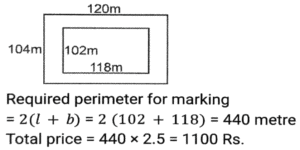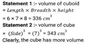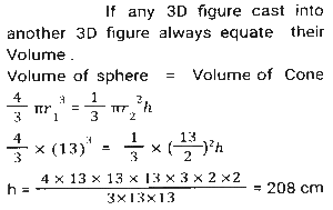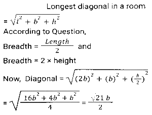 Mensuration (Part-11)Total Questions: 5011. A rectangular park is 120 m long and 104 m wide. A 1m wide path runs along the boundary of the park, remaining completely inside the park area. Thus, the outside edges of the path run along the boundary wall of the park. The inside edges of the path are marked with a white line of negligible thickness. If it costs ₹2.50 to mark each metre with the white line, then how much would it cost (in ₹) to fully mark the inside edges of the path ? [SSC CGL Tier II (02/03/2023)](a) 1090(b) 1080(c) 1120(d) 1100Correct Answer: (d) 1100Solution:12. What is the total surface area of a pyramid whose base is a square with side 8 cm and height of the pyramid is 3 cm? [SSC CGL Tier II (03/03/2023)](a) 169 cm²(b) 121 cm²(c) 144 cm²(d) 184 cm²Correct Answer: (c) 144 cm²Solution:13. The breadth 'b' of a room is twice its height and half of its length. Find the length of the longest diagonal of the room. [SSC CGL Tier II (03/03/2023)](a)(b)(c)(d)Correct Answer: (c)Solution:14. A pyramid has an equilateral triangle as its base, of which each side is 8 cm. Its slant edge is 24 cm. The whole surface area of the pyramid (in cm²) is: [SSC CGL Tier II (03/03/2023)](a)(b)(c)(d)Correct Answer: (d)Solution:15. The difference between the length of two parallel sides of a trapezium is 12 cm. The perpendicular distance between these two parallel sides is 60 cm. If the area of the trapezium is 1380 cm², then find the length of each of the parallel sides (in cm). [SSC CGL Tier II (06/03/2023)](a) 27, 15(b) 31, 19(c) 29, 17(d) 24, 12Correct Answer: (c) 29, 17Solution:16. How many spherical lead shots each of diameter 8.4 cm can be obtained from a rectangular solid of lead with dimension 88 cm, 63 cm, 42 cm. (take π = 22/7) [SSC CGL 01/12/2022 (1st Shift)](a) 920(b) 750(c) 650(d) 860Correct Answer: (b) 750Solution:17. A solid metallic sphere of radius 13 cm is melted and recast into a cone having diameter of the base as 13 cm. What is the height (cm) of the cone ? [SSC CGL 01/12/2022 (3rd Shift)](a) 246(b) 152(c) 174(d) 208Correct Answer: (d) 208Solution:18. Which of the following two will provide more volume ? [SSC CGL 02/12/2022 (1st Shift)]I) A cuboid of edges 6 cm,7 cm and 8 cm II) A cube of edge 7 cm(a) Cube will have more volume(b) Both will have equal volume(c) Cuboid will have more volume(d) Cannot be determinedCorrect Answer: (a) Cube will have more volumeSolution:19. A hemispherical bowl made of iron has an inner diameter of 84 cm. Find the cost of tin plating it on the inside at the rate of ₹21 per 100 cm² (take π = 22/7) correct to two places of decimal. [SSC CGL 02/12/2022 (1st Shift)](a) ₹2,328.48(b) ₹2,425.48(c) ₹2,425.60(d) ₹2,355.48Correct Answer: (a) ₹2,328.48Solution:20. The radius of a right circular cylinder is five times of its height. If the height of the cylinder is 3.5 cm, then what is the volume of the cylinder? [SSC CGL 02/12/2022 (3rd Shift)](a) 3368.75 cm³(b) 3872.75 cm³(c) 3146.75 cm³(d) 3524.25 cm³Correct Answer: (a) 3368.75 cm³Solution:Submit Quiz« Previous12345Next »