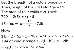 3. The length of a cold storage is 5 times its breadth, and its height is 8 m. The area of its four walls (including the doors) is 720 m². Find the total surface area of cold storage. [SSC CPO 10/11/2022 (Afternoon)]