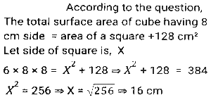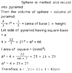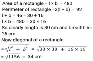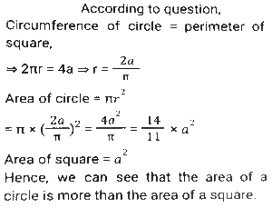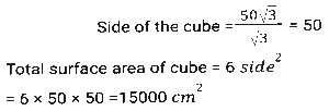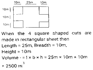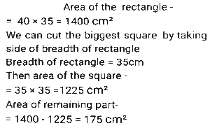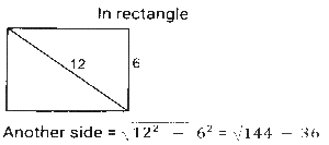 Mensuration (Part-12)Total Questions: 5031. The length and the breadth of a rectangular cardboard are 40 cm and 35 cm, respectively. If the biggest possible square is cut out from this cardboard, what is the area of the remaining part of the cardboard? [SSC MTS 08/07/2022 (Afternoon)](a) 175 cm²(b) 275 cm²(c) 425 cm²(d) 325 cm²Correct Answer: (a) 175 cm²Solution:32. The diagonal of a rectangle is 12 cm long and it is twice as long as one of the sides of the rectangle. Find area of the rectangle? [SSC MTS 08/07/2022 (Evening)](a) 25√3 cm²(b) 30√3 cm²(c) 36√3 cm²(d) 42√3 cm²Correct Answer: (c) 36√3 cm²Solution:33. A solid sphere whose radius is 21 cm is melted and recast into a regular pyramid of square base. If the height of the pyramid is 66 cm, then what is the length of each side of the base of the pyramid ? [use π = 22/7] [SSC MTS 08/07/2022 (Evening)](a) 68 cm(b) 85 cm(c) 42 cm(d) 48 cmCorrect Answer: (c) 42 cmSolution:34. The total surface area of a closed cube is 128 cm² than the area of a square. If the length of each side of the cube is 8 cm, then what is the length of each side of the square? [SSC MTS 11/07/2022 (Morning)](a) 16 cm(b) 12 cm(c) 18 cm(d) 9 cmCorrect Answer: (a) 16 cmSolution:35. In a camp, there are tents of the same shape and size. Each tent is cylindrical up to a height of 4 m and conical above it. The diameters of the bases of the cylinder and the cone are both 10.5 m and the slant height of the conical part is 10 m. If a total of 3861m² canvas is used in making all the tents, then how many tents are there in the camp ? [use π = 22/7] [SSC MTS 11/07/2022 (Evening)](a) 11(b) 7(c) 19(d) 13Correct Answer: (d) 13Solution:36. A rectangular LCD has an area of 480 cm² and a perimeter of 92 cm. If the size of the LCD is defined in term of length of the diagonal, then what is the size of the LCD? [SSC MTS 12/07/2022 (Evening)](a) 34 cm(b) 39 cm(c) 31 cm(d) 35 cmCorrect Answer: (a) 34 cmSolution:37. If the circumference of a circle is equal to the perimeter of a square and the radius of the given circle is positive, then which of the following options is correct? [SSC MTS 12/07/2022 (Evening)](a) Area of the circle > Area of the square(b) Area of the circle ≥ Area of the square(c) Area of the circle < Area of the square(d) Area of the circle = Area of the squareCorrect Answer: (a) Area of the circle > Area of the squareSolution:38. If the length of one side of a rectangle is twice that of the other side, and its perimeter is 54 cm, then what is the length of the longer side of this rectangle? [SSC MTS 13/07/2022 (Evening)](a) 14 cm(b) 9 cm(c) 27 cm(d) 18 cmCorrect Answer: (d) 18 cmSolution:If length is 2x then breath is x Perimeter of rectangle = 2(l +b) = 54 2(2x + x) = 54 ⇒ x = 9 Length = 2x = 2 x 9 = 18 cm39. A person uses a rectangular metallic sheet of 45 m x 30 m for making an open box. From each corner of the sheet he cut offs a square. If the length of one side of each of the squares is 10 m, then what will be the volume of the box (in m³) ? [SSC MTS 13/07/2022 (Evening)](a) 5000(b) 4500(c) 7000(d) 2500Correct Answer: (d) 2500Solution:40. The length of the longest diagonal that can be placed in a closed cube is 50√3 cm. What is the total surface area of this cube? [SSC MTS 14/07/2022 (Evening)](a) 15000 cm²(b) 10000 cm²(c) 12000 cm²(d) 6000 cm²Correct Answer: (a) 15000 cm²Solution:Submit Quiz« Previous12345Next »