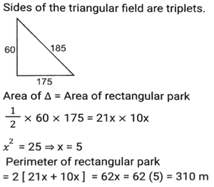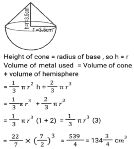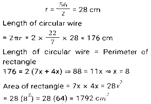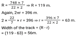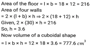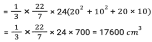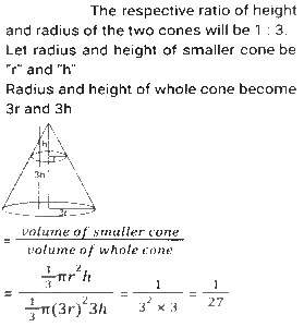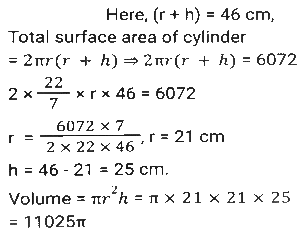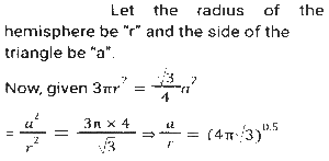 Mensuration (Part-14)Total Questions: 5041. The sum of the height and radius of the base of a solid right circular cylinder is 46 cm. If the total surface area of the solid cylinder is 6072 cm² what is the volume (in cm³) of the cylinder ? [SSC MTS 20/10/2021 (Evening)](a) 11025 π(b) 3030 π(c) 11020 π(d) 3036 πCorrect Answer: (a) 11025 πSolution:42. A solid right circular cone is cut into two parts by a plane parallel to its base and at a point one-third vertically below its vertex. What is the ratio of the volume of the smaller cone to that of the whole cone? [SSC MTS 20/10/2021 (Evening)](a) 1/9(b) 1/8(c) 1/27(d) 1/3Correct Answer: (c) 1/27Solution:43. A horse racecourse is in the form of an annular ring whose outer and inner circumferences are 748 m and 396 m, respectively. The width (in m) of the racecourse is: (π = 22/7) [SSC MTS 22/10/2021 (Morning)](a) 176(b) 88(c) 56(d) 28Correct Answer: (c) 56Solution:44. A hall is 18 m long and 12 m broad. If the area of the floor is equal to the sum of the areas of the four walls, the volume (in m³) of the hall is: [SSC MTS 22/10/2021 (Evening)](a) 876.2(b) 777.6(c) 576.4(d) 675.5Correct Answer: (b) 777.6Solution:45. The area of a triangular field with sides 60 m, 175 m and 185 m is equal to that of a rectangular park whose sides are in the ratio of 21:10. The perimeter (in m) of the park is: [SSC MTS 26/10/2021 (Afternoon)](a) 341(b) 403(c) 372(d) 310Correct Answer: (d) 310Solution:46. A circular wire of diameter 56 cm is folded in the shape of a rectangle whose sides are in the ratio 7 : 4. The area enclosed by the rectangle is: [SSC MTS 26/10/2021 (Evening)](a) 1842(b) 1792(c) 1684(d) 1782Correct Answer: (b) 1792Solution:47. A solid metallic toy has a hemispherical base with radius 3.5 cm surmounted by a cone. If the height of the cone is the same as the radius of its base, then the volume of metal used in cm³ [SSC MTS 27/10/2021 (Morning)](a)(b)(c)(d)Correct Answer: (c)Solution:48. A bucket in the shape of the frustum of a cone has its top and bottom radii as 20 cm and 10 cm, respectively. The depth of the bucket is 24 cm. The capacity of the bucket (in cm³) is: (π = 22/7) [SSC MTS 02/11/2021 (Morning)](a) 8800 cm³(b) 13200 cm³(c) 17000 cm³(d) 17600 cm³Correct Answer: (d) 17600 cm³Solution:49. A rectangle of dimension 10 cm and 5 cm is placed adjacent to another rectangle of the same size to draw an L shape figure. Find the perimeter of the shape so formed. [SSC MTS 02/11/2021 (Morning)](a) 100(b) 40(c) 50(d) 60Correct Answer: (c) 50Solution:50. The total surface area of a hemisphere is nearly equal to that of an equilateral triangle. The side of the triangle is how many times (approximately) of the radius of the hemisphere? [SSC MTS 02/11/2021 (Evening)](a)(b)(c)(d)Correct Answer: (d)Solution:Submit Quiz« Previous12345