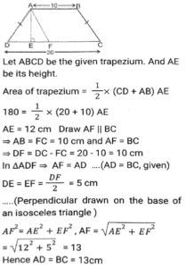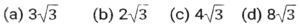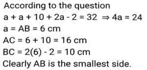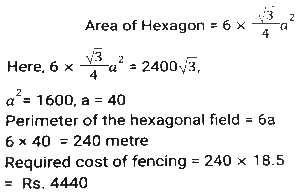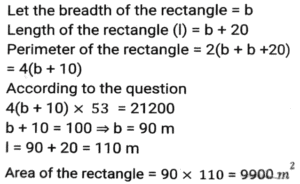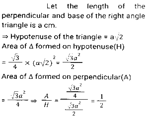 Mensuration (Part-2)Total Questions: 5011. Equilateral triangles are drawn on the hypotenuse and one of the perpendicular sides of a right-angled isosceles triangle. Their areas are H and A respectively A/H is equal to: [SSC CHSL 10/07/2019 (Afternoon)](a)(b)(c)(d)Correct Answer: (b)Solution:12. Twelve sticks, each of length one unit, are used to form an equilateral triangle. The area of the triangle is: [SSC CHSL 10/07/2019 (Morning)](a)(b)(c)(d)Correct Answer: (c)Solution:13. If the length of a rectangle is decreased by 11% and the breadth is increased by 11%, its area will undergo: [SSC CHSL 09/07/2019 (Afternoon)](a) 13.13% increase(b) 1.21% increase(c) 1.21%decrease(d) 13.13% decreaseCorrect Answer: (c) 1.21%decreaseSolution:14. In triangle ABC, the length of BC is less than twice the length of AB by 2 cm. The length of AC exceeds the length of AB by 10 cm. The perimeter is 32cm. The length (in cm) of the smallest side of the triangle is: [SSC CHSL 05/07/2019 (Afternoon)](a) 4(b) 10(c) 8(d) 6Correct Answer: (d) 6Solution:15. The parallel sides of a trapezium are 20 cm and 10 cm and its non-parallel sides are equal to each other. If its area is 180 cm², then what is the length (in cm) of each non parallel side? [SSC CHSL 04/07/2019 (Morning)](a) 11(b) 13(c) 12(d) 15Correct Answer: (b) 13Solution:16. The length of a rectangular park is 20m more than its breadth. If the cost of fencing the park at Rs. 53 per metre is Rs. 21,200, then what is the area (In square metres) of the park ? [SSC CHSL 03/07/2019 (Evening)](a) 9504(b) 8925(c) 9240(d) 9900Correct Answer: (d) 9900Solution:17. A wire is in the shape of a rectangle whose sides are in the ratio 7: 4. It was initially in the shape of a circle of radius, very nearly equal to 31.5 cm. The length of smaller side of the rectangle is : (Take π = 22/7) [SSC CHSL 03/07/2019 (Afternoon)](a) 44 cm(b) 36 cm(c) 40 cm(d) 32cmCorrect Answer: (b) 36 cmSolution:18. A circle circumscribes a rectangle whose sides are in the ratio 4: 3. If the perimeter of the rectangle is 56 cm, then what is the area (In square cm) of the circle? [SSC CHSL 03/07/2019 (Morning)](a) 70π(b) 96π(c) 90π(d) 100πCorrect Answer: (d) 100πSolution:19. The curved surface area and volume of a cylindrical pole are 132 square metres and 528 cubic metres, respectively. What is the height (In m) of the pole? (Take π = 22/7) [SSC CHSL 02/07/2019 (Afternoon)](a)(b)(c)(d)Correct Answer: (d)Solution:20. The area of a field in the shape of a hexagon is 2400√3 square meters. What will be the cost(Rs.) of fencing it at Rs. 18.50 per meter? [SSC CHSL 01/07/2019 (Evening)](a) 4440(b) 5920(c) 5550(d) 5180Correct Answer: (a) 4440Solution:Submit Quiz« Previous12345Next »
