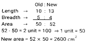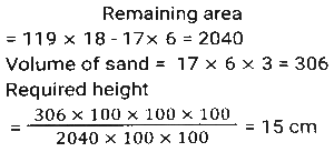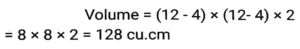 Mensuration (Part-2)Total Questions: 5031. A solid cube of volume 13824 cm³ is cut into 8 cubes of equal volumes. The ratio of the surface area of the original cube to the sum of the surface areas of three of the smaller cubes is: [SSC CGL 04/06/2019 (Morning)](a) 2:3(b) 4:3(c) 8:3(d) 2:1Correct Answer: (b) 4:3Solution:32. The unequal side of an isosceles triangle is 2cm. The medians drawn to the equal sides are perpendicular. The area of the triangle is: [SSC CPO 16/03/2019 (Evening)](a) 2cm²(b) 3cm²(c) 5cm²(d) 1cm²Correct Answer: (b) 3cm²Solution: 33. A steel vessel has a base of length 60 cm and breadth 30 cm. Water is poured in the vessel. A cubical steel box having an edge of 30 cm is immersed completely in the vessel. By how much will the water rise? [SSC CPO 16/03/2019 (Evening)](a) 12 cm(b) 15 cm(c) 10 cm(d) 9 cmCorrect Answer: (b) 15 cmSolution:34. Original breadth of a rectangular box is 20cm. The box was then remade in such a way that its length increased by 30% but the breadth decreased by 20% and the area increased by 100 cm². What is the new area(in cm²) of the box? [SSC CPO 16/03/2019 (Evening)](a) 2500(b) 2200(c) 2600(d) 2400Correct Answer: (c) 2600Solution:35. Find the cost of carpeting a room which is 11m long and 6m broad by a carpet which is 60cm broad at the rate of rs 112.50 per meter. [SSC CPO 16/03/2019 (Afternoon)](a) 12,375(b) 13,280(c) 11,695(d) 12,040Correct Answer: (a) 12,375Solution:36. A field is 119m x 18m in dimension. A tank 17m x 6m x 3m is dug out in the middle and the soil removed is evenly spread over the remaining part of the field. The increase in the level on the remaining part of the field is: (in cm) [SSC CPO 16/03/2019 (Afternoon)](a) 14 cm(b) 13 cm(c) 15 cm(d) 12 cmCorrect Answer: (c) 15 cmSolution:37. A swimming pool is 40 m in length, 30 m in breadth and 2.2 m in depth. The cost of cementing its floor and the four sides at Rs. 25/m² is: [SSC CPO 16/03/2019 (Afternoon)](a) Rs.43,980(b) Rs.37540(c) Rs.34260(d) Rs.37700Correct Answer: (d) Rs.37700Solution:38. A square cardboard with side 3 m is folded through one of its diagonal to make a triangle, the height(m) of the triangle is: [SSC CPO 16/03/2019 (Morning)](a)(b)(c)(d)Correct Answer: (a)Solution:39. If the area of a regular hexagon is 108√3cm², its perimeter (in cm) is: [SSC CPO 15/03/2019 (Evening)](a) 36√2(b) 42√2(c) 28√3(d) 24Correct Answer: (a) 36√2Solution:40. A square piece of cardboard with side 12 cm has a small square of 2 cm cut out from each of the corners. The resulting flaps are turned up to make a box 2 cm deep. The volume (in cm³) of the box is: [SSC CPO 15/03/2019 (Evening)](a) 128(b) 94(c) 102(d) 11Correct Answer: (a) 128Solution:Submit Quiz« Previous12345Next »
