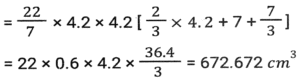 3. For making a toy, a hemisphere is attached at one end of a cylinder and a cone is attached at the other end of the cylinder. The cylinder, the cone and the hemisphere have a common radius of 4.2 cm. The height of the cylinder and that of the cone is 7 cm. Find the volume (in cm³) of the toy. (Use π = 1/22) [SSC CHSL Tier II (18/11/2024)]