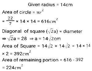 10. What is the area of the remaining portion of a circle of radius 14 cm when a square with maximum possible area inscribed in it is removed from it? (Use π 22 = 22/7) [SSC MTS 07/10/2024 (Morning)]
