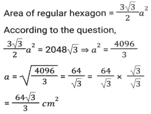 4. The area of a regular hexagon is 2048√3 cm². What is the length (in cm) of each side of the hexagon ? [SSC MTS 30/09/2024 (Morning)]