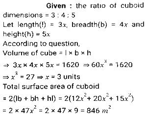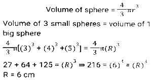 Mensuration (Part-5)Total Questions: 5041. If the height of a solid right circular cylinder is 27 cm and diameter of its base is 30 cm, the total surface area (in cm²) of the right circular cylinder is: (Take π = 22/7) [SSC CHSL 04/07/2024 (4th Shift)](a) 3978(b) 3960(c) 3976(d) 3964Correct Answer: (b) 3960Solution:42. 3 solid spheres of diameters 6 cm, 8 cm and 10 cm are melted together to form a single solid sphere. Find its radius. [SSC CHSL 04/07/2024 (4th Shift)](a) 3 cm(b) 12 cm(c) 9 cm(d) 6 cmCorrect Answer: (d) 6 cmSolution:43. The ratio of the lateral surface area to the total surface area of a cylinder with base diameter 60 cm and height 10 cm is: [SSC CHSL 04/07/2024 (4th Shift)](a) 1:9(b) 1:3(c) 1:7(d) 1:4Correct Answer: (d) 1:4Solution:44. The length, breadth and height of a cuboid are in ratio of 3 : 4 : 5. If the volume of the cuboid is 1620 m³, find the total surface area of the cuboid. [SSC CHSL 05/07/2024 (1st Shift)](a) 646 m²(b) 846 m²(c) 423 m²(d) 712 m²Correct Answer: (b) 846 m²Solution:45. A cylindrical oil tank has a radius of 5 m and a total surface area of 628 m², what would be its curved surface area? (round off to the second decimal place) [SSC CHSL 05/07/2024 (1st Shift)](a) 401.43 m²(b) 371.83 m²(c) 470.8 m²(d) 481.43 m²Correct Answer: (c) 470.8 m²46. Rajesh is playing with a football having diameter of 28 cm. He wants to get a photo of his favourite player painted on the entire ball. The painter charges ₹2/cm². What will be the cost (in ₹) of painting the ball (take π =22/7) ? [SSC CHSL 05/07/2024 (1st Shift)](a) 4,928(b) 2,414(c) 4,828(d) 2,464Correct Answer: (a) 4,92847. A solid copper sphere of radius 9 cm is drawn into a wire of radius 4 mm. Find the length of the wire [SSC CHSL 05/07/2024 (2nd Shift)](a) 70.25 m(b) 60.75 m(c) 20.75 m(d) 65.25 mCorrect Answer: (b) 60.75 m48. Find the height of the triangle whose base is two-thirds of its height and whose area is 363 cm² [SSC CHSL 05/07/2024 (2nd Shift)](a) 33 cm(b) 27 cm(c) 29 cm(d) 31 cmCorrect Answer: (a) 33 cm49. Find the percentage increase in surface area of a cube by triple each side. [SSC CHSL 05/07/2024 (3rd Shift)](a) 700%(b) 800%(c) 650%(d) 500%Correct Answer: (b) 800%50. If the length, breadth and total surface area of a cuboid are 30 cm, 20 cm and 2600 cm², respectively, then find its height. [SSC CHSL 05/07/2024 (3rd Shift)](a) 50 cm(b) 30 cm(c) 14 cm(d) 15 cmCorrect Answer: (c) 14 cmSubmit Quiz« Previous12345