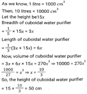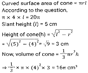 Mensuration (Part-6)Total Questions: 5011. The length of a rectangular shaped park exceeds its breadth by 15 m. If the perimeter of the park is 110 m, find the length of the park (in m). [SSC CHSL 09/07/2024 (1st Shift)](a) 35(b) 40(c) 25(d) 20Correct Answer: (a) 35Solution:12. If the lateral surface area of a cube is 144 cm², then find its volume. [SSC CHSL 09/07/2024 (1st Shift)](a) 864 cm³(b) 1728 cm³(c) 117.58 cm³(d) 216 cm³Correct Answer: (d) 216 cm³Solution:13. If the areas of three adjacent faces of a cuboid are 5 cm², 15 cm², 27 cm², pectively, the surface area of the cuboid is: [SSC CHSL 09/07/2024 (1st Shift)](a) 75 cm²(b) 47 cm²(c) 45 cm²(d) 94 cm²Correct Answer: (d) 94 cm²Solution:14. A closed cylindrical tank of radius 1.5 m and height 3 m is made from a sheet of metal, how much sheet of metal is required to do it ? [SSC CHSL 09/07/2024 (2nd Shift)](a) 42.24 square metre(b) 24.24 square metre(c) 42.42 square metre(d) 24.42 square metreCorrect Answer: (c) 42.42 square metreSolution:15. Two cubes have their volumes in the ratio 1:125. Find the ratio of their surface areas. [SSC CHSL 09/07/2024 (2nd Shift)](a) 1:125(b) 1:25(c) 1:5(d) 25:1Correct Answer: (b) 1:25Solution:16. If the radius of the base and slant height of the cone is 6 cm and 10 cm, respectively, then the volume of the cone is equal to: [SSC CHSL 09/07/2024 (3rd Shift)](a) 108 π cm³(b) 98 π cm³(c) 106 π cm³(d) 96 π cm³Correct Answer: (d) 96 π cm³Solution:17. Find the number of paper balls, each 2 cm in diameter, that can be made from a sphere of diameter 18 cm. [SSC CHSL 09/07/2024 (4th Shift)](a) 1020(b) 484(c) 625(d) 729Correct Answer: (d) 729Solution:18. A cuboidal water purifier can carry 10 litres of water. Its breadth is 1/5 of its heights and length is 1/3 of the sum of the breadth and length. The heights of the tank is: [SSC CHSL 10/07/2024 (1st Shift)](a) 20 cm(b) 10 cm(c) 80 cm(d) 50 cmCorrect Answer: (d) 50 cmSolution:19. A cube of edge 4 cm is cut into cubes each of edge of 2 cm. The ratio of the total surface area of one of the small cubes to that of the large cube is equal to: [SSC CHSL 10/07/2024 (2nd Shift)](a) 1 : 4(b) 1 : 64(c) 1 : 8(d) 1 : 16Correct Answer: (a) 1 : 4Solution:20. The curved surface area of a right circular cone is 20 cm². If its radius is 4 cm, then find the volume of cone. [SSC CHSL 10/07/2024 (2nd Shift)](a) 21 π cm³(b) 20 π cm³(c) 16 πcm³(d) 18 π cm³Correct Answer: (c) 16 πcm³Solution:Submit Quiz« Previous12345Next »