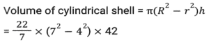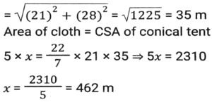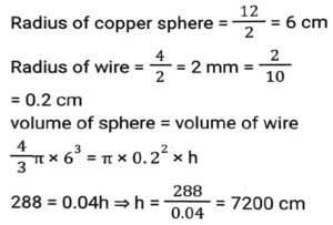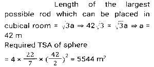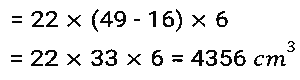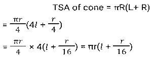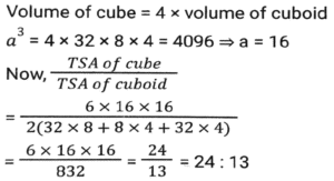 Mensuration (Part-6)Total Questions: 5031. The base of a parallelogram is twice its height. If the area of the parallelogram is 338cm², then find its height (in cm) [SSC CPO 27/06/2024 (1st Shift)](a) 13(b) 11(c) 14(d) 12Correct Answer: (a) 13Solution:32. What is the total surface area of a cone whose radius is r/4 and slant height is 4ℓ? [SSC CPO 27/06/2024 (1st Shift)](a)(b)(c)(d)Correct Answer: (b)Solution:33. How many metres of cloth will be required to make a conical tent, the radius of whose base is 21 metres and height is 28 metres. The width of the cloth is 5 metres. (Where π = 22/7) [SSC CPO 27/06/2024 (1st Shift)](a) 470(b) 462(c) 456(d) 478Correct Answer: (b) 462Solution:34. The volume of a cube is four times the volume of a cuboid. If the sides of the cuboid are 32 cm, 8 cm and 4 cm, then find the ratio of the total surface area of the cube to that of the cuboid. [SSC CPO 27/06/2024 (2nd Shift)](a) 23 : 13(b) 24 : 13(c) 21 : 13(d) 22 : 13Correct Answer: (b) 24 : 13Solution:35. A copper sphere of diameter 12 cm is drawn into a wire of diameter 4 mm. What is the length (in cm) of the 22 wire? (Where π = 22/7) [SSC CPO 27/06/2024 (2nd Shift)](a) 7200(b) 7823(c) 8342(d) 9000Correct Answer: (a) 7200Solution:36. The length of the largest possible rod that can be placed in a cubical room is 42√3 m. The surface area (in m²) of the largest possible sphere that fit within the cubical room is: [Use π = 22/7] [SSC CPO 27/06/2024 (2nd Shift)](a) 3590(b) 4589(c) 2564(d) 5544Correct Answer: (d) 5544Solution:37. Find the area of a minor sector of a circle whose circumference is 88 cm and the length of its minor arc is 22 cm (use π = 22/7) [SSC CPO 27/06/2024 (2nd Shift)](a) 154 cm²(b) 451 cm²(c) 415 cm²(d) 145 cm²Correct Answer: (a) 154 cm²Solution:38. A rectangular sheet of metal is 60 cm by 25 cm. Equal squares of side 5 cm are cut off at the corners and the remainder is folded up to form an open rectangular box. Find the volume of the box. [SSC CPO 27/06/2024 (3rd Shift)](a) 2750 cm³(b) 5750 cm³(c) 3750 cm³(d) 4750 cm³Correct Answer: (c) 3750 cm³Solution:39. A drainage tile is a cylindrical shell 42 cm long. The inside and outside diameters are 8 cm and 14 cm, respectively. What is the volume (in cm³) of clay required for the tile? (Use π = 22/7) [SSC CPO 27/06/2024 (3rd Shift)](a) 5241(b) 4356(c) 4881(d) 4125Correct Answer: (b) 4356Solution:40. One laddoo with a radius of 5 cm belongs to a shopkeeper. How many laddoos of radius 2.5 cm may be created from the same one laddoo? [SSC CPO 28/06/2024 (1st Shift)](a) 2(b) 6(c) 4(d) 8Correct Answer: (d) 8Solution:Submit Quiz« Previous12345Next »