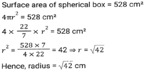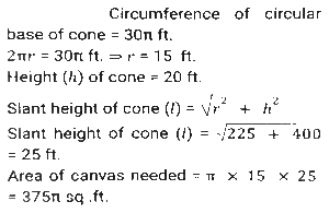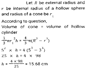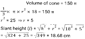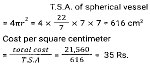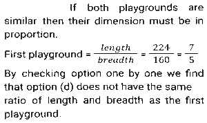 Mensuration (Part-6)Total Questions: 5041. The cost of painting a spherical vessel of diameter 14 cm is ₹21,560. What is the cost of painting (in) per 22 square centimetre ? (Use π = 22/7) [SSC CPO 28/06/2024 (1st Shift)](a) 30(b) 32(c) 28(d) 35Correct Answer: (d) 35Solution:42. The radius of the base and height of a cone are 5 cm and 6 cm, respectively, whereas the radius of the base and height of a cylinder are 2.5 cm and 3 cm, respectively. The ratio of the volume of the cone to that of the cylinder is: (Where π = 22/7) [SSC CPO 28/06/2024 (1st Shift)](a) 8 : 5(b) 9 : 4(c) 8 : 3(d) 3 : 5Correct Answer: (c) 8 : 3Solution:43. A cylinder of radius 7 cm has a curved surface area of 2200cm². Find its total surface area. (Use π = 22/7) [SSC CPO 28/06/2024 (2nd Shift)](a) 2508 cm²(b) 2260 cm²(c) 2550 cm²(d) 1580 cm²Correct Answer: (a) 2508 cm²Solution:44. A hollow sphere of external and internal diameters of 10 cm and 6 cm, respectively, is melted and made into another solid in the shape of a right circular cone of base diameter 10 cm. Find the height of the cone. [SSC CPO 28/06/2024 (2nd Shift)](a) 13.68 cm(b) 14.68 cm(c) 16.68 cm(d) 15.68 cmCorrect Answer: (d) 15.68 cmSolution:45. A spherical box has a surface area 528 cm². Find the radius of the spherical box. [SSC CPO 28/06/2024 (2nd Shift)](a) √37 cm(b) √42 cm(c) √29 cm(d) √35 cmCorrect Answer: (b) √42 cmSolution:46. The distance between the parallel sides of a trapezium is 18 cm. If the area of the trapezium is 1188 cm², then what is the sum of the lengths of the parallel sides? [SSC CPO 28/06/2024 (3rd Shift)](a) 150 cm(b) 115 cm(c) 126 cm(d) 132 cmCorrect Answer: (d) 132 cmSolution:47. The area of the canvas cloth needed to erect a right conical tent of height 20ft. and circular base of circumference 30π ft. is: [SSC CPO 28/06/2024 (3rd Shift)](a) 455π sq.ft.(b) 375π sq.ft.(c) 589π sq.ft.(d) 470π sq.ft.Correct Answer: (b) 375π sq.ft.Solution:48. The volume of a right circular cone is 150π cm³ and its height is 18 cm. Find its slant height (in cm) (correct to 2 decimal places). [SSC CPO 28/06/2024 (3rd Shift)](a) 18.68(b) 25.35(c) 28.68(d) 15.25Correct Answer: (a) 18.68Solution:49. A school has two rectangular playgrounds, which are similar in shape. If the length and the breadth of the first playground are given as 224 m and 160 m, respectively, then which of the following options CANNOT be the dimensions of the second playground? [SSC CPO 29/06/2024 (1st Shift)](a) Length = 273 m; Breadth = 195 m(b) Length = 168 m; Breadth = 120 m(c) Length = 210 m; Breadth = 150 m(d) Length = 343 m; Breadth = 255 mCorrect Answer: (d) Length = 343 m; Breadth = 255 mSolution:50. The height and radius of a cone-shaped storage tank are 9 ft. and 7 ft., respectively. Find the volume of water the tank can hold ? (Use π = 22/7) [SSC CPO 29/06/2024 (1st Shift)](a) 462 cubic ft.(b) 527 cubic ft.(c) 1386 cubic ft.(d) 1423 cubic ft.Correct Answer: (a) 462 cubic ft.Solution:Submit Quiz« Previous12345