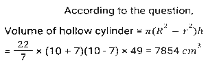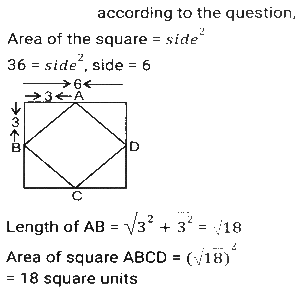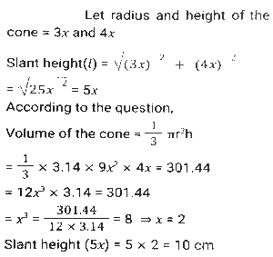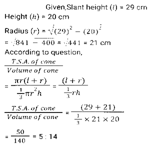 Mensuration (Part-8)Total Questions: 5011. If the slant height of a cone is 29 cm and its height is 20 cm, find the ratio between the magnitudes of total surface area and the volume. [SSC CPO 05/10/2023 (3rd Shift)](a) 3 : 7(b) 3 : 14(c) 5 : 14(d) 7 : 15Correct Answer: (c) 5 : 14Solution:12. The radius of a metallic spherical ball is 3 cm. If the metallic ball is melted and recast into x number of hemispheres of radius equal to half the radius of the metallic spherical ball, then find the value of x. [SSC CPO 05/10/2023 (3rd Shift)](a) 14(b) 16(c) 13(d) 15Correct Answer: (b) 16Solution:13. A hollow cylindrical tube made of plastic is 3 cm thick. If the external diameter is 20 cm and length of the tube is 49 cm, find the volume of the plastic. [SSC CPO 05/10/2023 (3rd Shift)](a) 7644 cm³(b) 7238 cm³(c) 7854 cm³(d) 7546 cm³Correct Answer: (c) 7854 cm³Solution:14. The diameter of a metallic sphere is 6 cm. It is melted and drawn into a wire having a diameter of the cross section as 0.4 cm. Find the length of the wire (in meters). [SSC MTS 01/09/2023 (1st Shift)](a) 18(b) 9(c) 12(d) 10Correct Answer: (b) 9Solution:15. From a cuboid of dimension of 8 x 6 x 6 units, small cubes of dimension 0.5 x 0.5 x 0.5 unit are cut. How many small cubes can be cut from the big cuboid? [SSC MTS 01/09/2023 (3rd Shift)](a) 576(b) 1152(c) 2304(d) 1552Correct Answer: (c) 2304Solution:16. The radius and the height of a right circular cone are in the ratio 3: 4. If its volume is 301.44m³, find the slant height (use π = 3.14). [SSC MTS 04/09/2023 (1st Shift)](a) 5 cm(b) 20 cm(c) 10 cm(d) 15 cmCorrect Answer: (c) 10 cmSolution:17. Water is pouring into a cuboidal reservoir at the rate of 50 litres per minute. The volume of the reservoir is 120 m³. How many hours will it take to fill the reservoir ? [SSC MTS 04/09/2023 (3rd Shift)](a) 35(b) 45(c) 40(d) 30Correct Answer: (c) 40Solution:18. Using the middle points of sides of a square with an area of 36 square units, another square is made. What is the area of a new square made in square units? [SSC MTS 05/09/2023 (2nd Shift)](a) 24(b) 27(c) 18(d) 21Correct Answer: (c) 18Solution:19. The length of the median of an equilateral triangle is 6√3 cm. The area of the triangle is: [SSC MTS 05/09/2023 (3rd Shift)](a) 36√3 cm²(b) 36 cm²(c) 72 cm²(d) 72√3 cm²Correct Answer: (a) 36√3 cm²Solution:20. The areas of three adjacent faces 2 of a cuboid are p, q and r unit², respectively. What is its volume? [SSC MTS 06/09/2023 (3rd Shift)](a)(b)(c)(d)Correct Answer: (b)Solution:Submit Quiz« Previous12345Next »