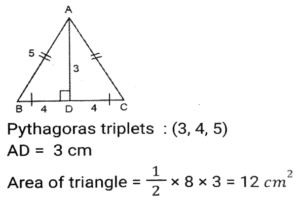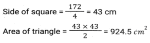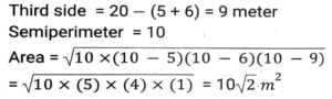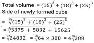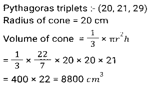 Mensuration (Part-8)Total Questions: 5031. If the height and slant height of a cone are 21 cm and 29 cm, respectively. 22 Find the volume. (Use π = 22/7) [SSC CHSL 02/08/2023 (3rd Shift)](a) 8800 cm³(b) 8780 cm³(c) 8440 cm³(d) 8080 cm³Correct Answer: (a) 8800 cm³Solution:32. The perimeter of a parallelogram is 48 cm. If the height of the parallelogram is 6 cm and the length of the adjacent side is 8 cm. find its area. [SSC CHSL 03/08/2023 (1st Shift)](a) 90 cm²(b) 80 cm²(c) 84 cm²(d) 96 cm²Correct Answer: (d) 96 cm²Solution:33. In an isosceles triangle, if the unequal side is 8 cm and equal side is 5 cm, then the area of the triangle is: [SSC CHSL 03/08/2023 (1st Shift)](a) 12 cm²(b) 25 cm²(c) 6 cm²(d) 11 cm²Correct Answer: (a) 12 cm²Solution:34. Find the volume of the largest possible sphere circumscribed by a cube of edge 7 cm. [SSC CHSL 03/08/2023 (2nd Shift)](a) 179.67 cm³(b) 169.67 cm³(c) 189.67 cm³(d) 199.67 cm³Correct Answer: (a) 179.67 cm³Solution:35. If a map of a city was drawn on a scale of 0.2 cm to a km, what area would represent a country if it has an area of 22500 km²? [SSC CHSL 04/08/2023 (2nd Shift)](a) 2500 cm²(b) 2250 cm²(c) 5625 cm²(d) 900 cm²Correct Answer: (d) 900 cm²Solution:36. The sides of the three cubes of metal are 15 cm, 18 cm and 25 cm, respectively. Find the side (in cm) of the new cube formed by melting these cubes together [SSC CHSL 04/08/2023 (2nd Shift)](a)(c)(d)(d)Correct Answer: (d)Solution:37. A shopkeeper usually makes one big besan laddoo (spherical in shape) with a radius of 9 cm. With the same laddoo, How many besan laddoos of radius 3 cm can be made?(Use π = 22/7) [SSC CHSL 04/08/2023 (3rd Shift)](a) 9(b) 18(c) 36(d) 27Correct Answer: (d) 27Solution:38. The area of a triangle is half the area of a square. The perimeter of the square is 172 cm. What is the area of the triangle (in cm²) ? [SSC CHSL 04/08/2023 (4th Shift)](a) 924.5(b) 1984(c) 1849(d) 992Correct Answer: (a) 924.5Solution:39. A cuboidal water tank is 12 m long, 9 m wide and 7.5 m deep. How many litres of water can it hold? [SSC CHSL 08/08/2023 (1st Shift)](a) 840000(b) 805000(c) 780000(d) 810000Correct Answer: (d) 810000Solution:40. What is the area of a triangular flower bed of a garden whose perimeter is 20 metres and two sides are 5 metres and 6 metres. [SSC CHSL 08/08/2023 (4th Shift)](a)(b)(c)(d)Correct Answer: (a)Solution:Submit Quiz« Previous12345Next »
