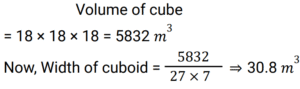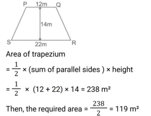 Mensuration (Railway Maths) (Part – II)Total Questions: 501. Find the area of the parallelogram whose base is 15 cm and the corresponding height is 6 cm. [Group D 24/08/2022 (Morning)](a) 80 cm²(b) 45 cm²(c) 90 cm²(d) 60 cm²Correct Answer: (c) 90 cm²Solution:Area of parallelogram= base × height = 15 × 6 = 90 cm²2. Find the cost of fencing a rectangular plot of land at the rate of ₹30 per meter, whose area is 100 m², and the length of one side is 20 m. [Group D 24/08/2022 (Afternoon)](a) ₹1,500(b) ₹2,400(c) ₹3,000(d) ₹1,200Correct Answer: (a) ₹1,500Solution:Area of rectangle = 100 m²Length = 20 m, Breadth = 100 ÷ 20 = 5 mPerimeter of rectangle= 2 × (20 + 5) = 2 × 25 = 50 mCost of fencing = 50 × 30 = ₹15003. The floor of an office has dimensions 5 m x 3 m. The cost of painting the walls and ceiling is ₹7,440 at the rate of ₹60/m². Find the height of the room (in meters). (rounded off to one decimal place) [Group D 24/08/2022 (Evening)](a) 4.5(b) 5.6(c) 3.5(d) 6.8Correct Answer: (d) 6.8Solution:Area of walls and ceiling= 7440/ 60 = 124 m²Area of four walls + area of ceiling = 124⇒ 2 × (5 + 3) × height + 5 × 3 = 124⇒ 16 × height = 124 - 15⇒ 16h = 109 ⇒ h = 6.8 m4. A cube made of edge 18 m is completely filled with milk. The milk is transferred into a cuboid of length 27 m and height 7 m. The width of the cuboid is: [Group D 25/08/2022 (Morning)](a) 72.5 m(b) 54.6 m(c) 12.7 m(d) 30.8 mCorrect Answer: (d) 30.8 mSolution:5. How many cylinders of radius 10 cm and height 20 cm can be filled with water from a cylinder of radius 20 cm and height 100 cm full of water? [Group D 25/08/2022 (Afternoon)](a) 20(b) 30(c) 60(d) 40Correct Answer: (a) 20Solution:6. The radius and height of a cylinder are in the ratio 2 : 1. Find its total surface area if the curved surface area is 616 m². [Group D 25/08/2022 (Afternoon)](a) 908 m²(b) 1848 m²(c) 1232 m²(d) 1512 m²Correct Answer: (b) 1848 m²Solution:7. Find the volume of a cuboid whose length is 12 m, breadth is 10 m, and height is 15 m. [Group D 25/08/2022 (Evening)](a) 1800 m³(b) 1800 m²(c) 1500 m³(d) 1500 m²Correct Answer: (b) 1800 m²Solution:Volume of cuboid = length × breadth × height= 12 × 10 × 15 = 1800 m³8. A parallelogram has one parallel side length of 12 cm and perpendicular distance between its base and other parallel side is 8 cm. Its area is: [Group D 25/08/2022 (Evening)](a) 96 cm²(b) 192 cm²(c) 48 cm²(d) 24 cm²Correct Answer: (a) 96 cm²Solution:Area of parallelogram = base × perpendicular distance= 12 × 8 ⇒ 96 cm²9. Find the total surface area of a closed cuboid whose length, breadth, and height are 16 cm, 12 cm, and 8 cm, respectively. [Group D 26/08/2022 (Morning)](a) 238 cm²(b) 382 cm²(c) 832 cm²(d) 823 cm²Correct Answer: (c) 832 cm²Solution:Total surface area of cuboid= 2(lb + bh + hl)⇒ 2(16 × 12 + 12 × 8 + 8 × 16)⇒ 2(192 + 96 + 128) = 2 × 416 = 832 cm²10. In a trapezium field, PQRS, PQ || RS, PQ = 12m, RS = 22m, distance between PQ and RS is 14m. In this, two crops are to be sown in equal areas. Find the area available for each crop. [Group D 26/08/2022 (Afternoon)](a) 119 m²(b) 213 m²(c) 190 m²(d) 238 m²Correct Answer: (a) 119 m²Solution:Submit Quiz12345Next »