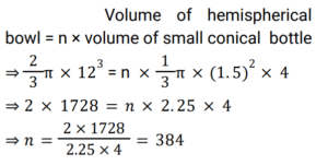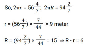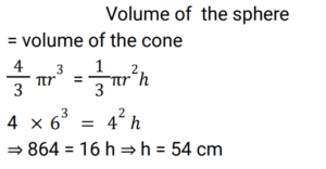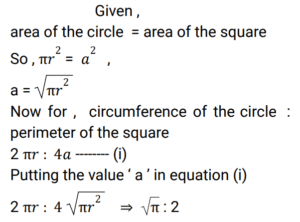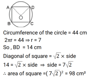 Mensuration (Railway Maths) (Part – IX)Total Questions: 5011. If the circumference and area of a circle are numerically equal then the radius of the circle is: [RRB NTPC 01/04/2021 (Morning)](a) 4 units(b) 2 units(c) 16 units(d) 1 unitCorrect Answer: (b) 2 unitsSolution:Circumference and Area of a circle are numerically equal. ⇒ π𝑅²= 2π𝑅 ⇒ 𝑅 = 2 𝑢𝑛𝑖𝑡12. A rectangular box has sides 3, 4 and 5 cm. What will be the maximum length of a stick that can be placed inside the box? [RRB NTPC 01/04/2021 (Evening)](a) 5 cm(b) 4 cm(c) 2√5 cm(d) 5√2 cmCorrect Answer: (d) 5√2 cmSolution:13. The area of a circle is equal to the area of a square. What is the ratio of the circumference of the circle to the perimeter of the square? [RRB NTPC 01/04/2021 (Evening)](a) √2π : 1(b) √π : 2(c) π : 2(d) 2 : √πCorrect Answer: (b) √π : 2Solution:14. A spherical ball of 12 cm diameter is melted and cast into a cone, the base of which has a diameter of 8 cm. What is the height of the cone? [RRB NTPC 01/04/2021 (Evening)](a) 42 cm(b) 36 cm(c) 54 cm(d) 48 cmCorrect Answer: (c) 54 cmSolution:15. A hemispherical bowl of internal radius of 12 cm contains a Liquid. This liquid is to be filled into conical shaped small bottles of base diameter 3 cm and height 4 cm. How many same types of bottles will be needed to empty the bowl? [RRB NTPC 03/04/2021 (Morning) ](a) 520(b) 384(c) 438(d) 400Correct Answer: (b) 384Solution:16. The perimeters of two squares are 48 cm and 60 cm. Find the perimeter of a third square whose area is equal to the difference of the area of the squares. [RRB NTPC 03/04/2021 (Morning) ](a) 32 cm(b) 44 cm(c) 36 cm(d) 40 cmCorrect Answer: (c) 36 cmSolution:17. The Capacity of a cylindrical tank is 38,500 litres. If the height is 4 metres, then what is the diameter of the base? [RRB NTPC 03/04/2021 (Morning) ](a) 7 m(b) 3.5 m(c) 17.5 m(d) 1.75 mCorrect Answer: (b) 3.5 mSolution:18. Find the answer of given question? [RRB NTPC 03/04/2021 (Morning) ](a) 2 m(b) 6 m(c) 9 m(d) 3 mCorrect Answer: (b) 6 mSolution:19. In a quadrilateral, the length of one of its diagonals is 23 cm and the perpendiculars drawn on this diagonal from other two vertices measure 17 cm and 7 cm respectively. Find the area of the quadrilateral. [RRB NTPC 03/04/2021 (Evening)](a) 276 cm²(b) 376 cm²(c) 300 cm²(d) 286 cm²Correct Answer: (a) 276 cm²Solution:20. Find the area of the greatest square that can be inscribed in a circle of circumference 44 cm. [RRB NTPC 03/04/2021 (Evening)](a) 49√2 cm²(b) 196 cm²(c) 49 cm²(d) 98 cm²Correct Answer: (d) 98 cm²Solution:Submit Quiz« Previous12345Next »