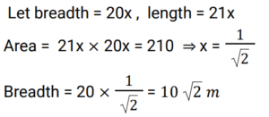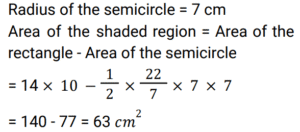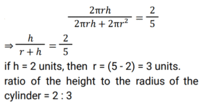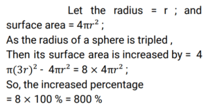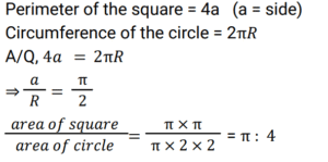 Mensuration (Railway Maths) (Part – IX)Total Questions: 5021. The perimeter of a square and circumference of a circle are the same. What is the ratio of the area of the square to that of the circle? [RRB NTPC 05/04/2021 (Morning)](a) π : 4(b) 4 : π(c) 2 : π(d) π : 2Correct Answer: (a) π : 4Solution:22. If a cube of side 20 cm is divided into smaller cubes of side 4 cm, then what is the total number of smaller cubes? [RRB NTPC 05/04/2021 (Morning)](a) 64(b) 125(c) 100(d) 27Correct Answer: (b) 125Solution:23. Find the volume of a cuboid, if its length is 2 times more than its breadth and the breadth is 12 cm which is twice its height. [RRB NTPC 05/04/2021 (Evening)](a) 2952 cm³(b) 2692 cm³(c) 2592 cm³(d) 2295 cm³Correct Answer: (c) 2592 cm³Solution:L = 12 + 24 = 36 cm, b = 12 cm , h = 6 cm Volume of the cuboid = l × b × h = 36 × 12 × 6 = 2592 cm³24. If the length, breadth and height of a room are 30 m, 20 m and 40 m respectively, then what will be the area of the four walls of the room? [RRB NTPC 05/04/2021 (Evening)](a) 3600 m²(b) 4000 m²(c) 4500 m²(d) 1800 m²Correct Answer: (b) 4000 m²Solution:Given, length = 30 m, breadth = 20 m and height = 40 m Area of the four wall = 2 (l + b )h Area of the four wall = 2 (30 + 20) × 40 = 4000 m²25. In a right circular cylinder, the ratio of the curved surface area to the total surface area is 2 : 5. Find the ratio of the height to radius of the cylinder. [RRB NTPC 06/04/2021 (Morning)](a) 3 : 4(b) 2 : 5(c) 5 : 3(d) 2 : 3Correct Answer: (d) 2 : 3Solution:26. The length of a rectangular solar panel is 5% more than its breadth. If the area of the solar panel is 210 m², find its breadth. [RRB NTPC 06/04/2021 (Morning)](a) 210 m(b) 20√2 m(c) 10√2 m(d) 10 mCorrect Answer: (c) 10√2 mSolution:27. Which one of the following triplets can be the measures of the sides of a triangle? [RRB NTPC 06/04/2021 (Morning)](a) 1, 2, 4(b) 11, 3, 7(c) 1, 1.5, 3(d) 5, 7, 4Correct Answer: (d) 5, 7, 4Solution:Here from the given options only the triplet : 5, 7, 4 can be the measures of the sides of a triangle. Because 5 + 7 > 4 , 7 + 4 > 5 and also 5 + 4 > 7 ;28. If the radius of a sphere is tripled, then its surface area is increased by: [RRB NTPC 06/04/2021 (Morning)](a) 800%(b) 400%(c) 300%(d) 900%Correct Answer: (a) 800%Solution:29. A semicircle has been drawn on the length of a rectangle. The area of the shaded region in the figure is: [RRB NTPC 06/04/2021 (Evening) ](a) 129 cm²(b) 63 cm²(c) 14 cm²(d) 77 cm²Correct Answer: (b) 63 cm²Solution:30. A path, 5m, wide runs around and outside a rectangular plot of land of length 10 m and breadth 8m. The area of path is: [RRB NTPC 07/04/2021 (Morning) ](a) 280 m²(b) 380 m²(c) 260 m²(d) 160 m²Correct Answer: (a) 280 m²Solution:Area of path = (10 + 5 + 5) × (8 + 5 + 5) - 10 × 8 = 360 - 80 ⇒ 280 m²Submit Quiz« Previous12345Next »