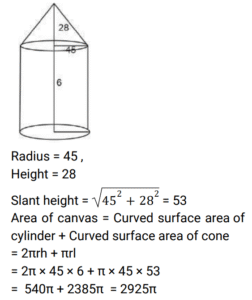 4. A tent is cylindrical upto a height of 6 m and conical above it. The diameter of the base is 90 m and the height of the conical part is 28 m. What is the area (in m²) of canvas used in making it? [Level 2 (13/06/2022) Shift 2]