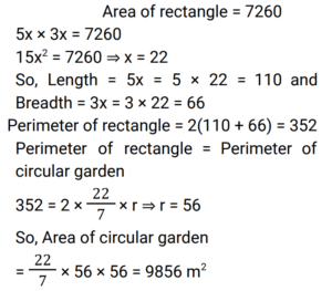 6. A lawn in the shape of a rectangle has an area of 7260 m² and its side are in the ratio 5 : 3. Its perimeter is equal to the perimeter of a circular garden. What is the area of the circular garden (take π = 22/7) [Level 3 (14/06/2022) Shift 1 ]