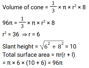 7. The volume of a solid cone is 96π cm³ and its height is 8 cm. What is its total surface area (in cm²)? [Level 3 (14/06/2022) Shift 1]
