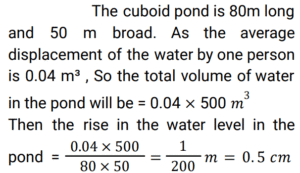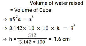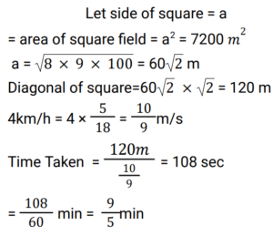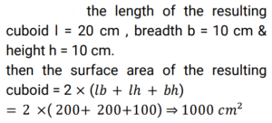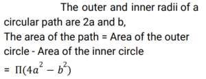 Mensuration (Railway Maths) (Part – VI)Total Questions: 5021. 500 persons are taking a dip in a cuboidal pond, which is 80 m long and 50 m broad. What is the rise in the water level in the pond, if the average displacement of the water by one person is 0.04 m³? [RRB NTPC 13/01/2021 (Evening)](a) 0.5 cm(b) 1 cm(c) 2.5 cm(d) 1.5 cmCorrect Answer: (a) 0.5 cmSolution:22. If two cubes, each with a side of 10 cm, are joined end to end, then find the surface area of the resulting cuboid. [RRB NTPC 13/01/2021 (Evening)](a) 1000 cm²(b) 100 cm²(c) 500 cm²(d) 300 cm²Correct Answer: (a) 1000 cm²Solution:23. If three cubes whose edges measure 3 cm, 4 cm and 5 cm respectively, are melted to form a single cube, then find the edge of the new cube. [RRB NTPC 16/01/2021 (Morning)](a) 4 cm(b) 7 cm(c) 6 cm(d) 5 cmCorrect Answer: (c) 6 cmSolution:24. A glass cylinder with diameter 20 cm has water to a height of 9 cm. A metal cube of 8 cm edge is immersed in it completely. Calculate the height water will rise in the cylinder (correct to 1 decimal place) by taking π = 3.142. [RRB NTPC 16/01/2021 (Morning)](a) 1.4 cm(b) 1.6 cm(c) 2.6 cm(d) 2 cmCorrect Answer: (b) 1.6 cmSolution:25. The area of a square field is 7200 m². How long will a cycle take to cross the field diagonally at a constant rate of 4 km/h? [RRB NTPC 16/01/2021 (Evening)](a) 9/5 minutes(b) 30 minutes(c) 25 minutes(d) 5 minutesCorrect Answer: (a) 9/5 minutesSolution:26. Find the total surface area of a cone, if its radius and slant height are 2r and (1/2) respectively. [RRB NTPC 17/01/2021 (Morning)](a) π (4r² + 1)(b) (4r² + 1) / 2(c) πr (4r + 1)(d) πr (2r + 1)Correct Answer: (c) πr (4r + 1)Solution:27. The area of the greatest circle that can be inscribed inside a square of side 21 cm is: [RRB NTPC 17/01/2021 (Evening)](a) 347 cm²(b) 351.5 cm²(c) 346.5 cm²(d) 350.5 cm²Correct Answer: (c) 346.5 cm²Solution:28. The floor of a hall is rectangular. Its length is 30 m and breadth is 24 m. How many carpets of size 6 m × 4 m are required to cover it? [RRB NTPC 17/01/2021 (Evening)](a) 24 carpets(b) 36 carpets(c) 28 carpets(d) 30 carpetsCorrect Answer: (d) 30 carpetsSolution:29. If the length of a rectangular solar panel having an area of 110 m² is 10% more than its breadth, then what will be the breadth? [RRB NTPC 18/01/2021 (Morning)](a) 10 m(b) 10√3 m(c) 20√3 m(d) 110 mCorrect Answer: (a) 10 mSolution:30. If the outer and inner radii of a circular path are 2a and b, then its area is_________sq units: [RRB NTPC 18/01/2021 (Morning)](a) (-4a² + b²)(b) π (−4a² + b²)(c) π (4a² − b²)(d) (4a² − b²)Correct Answer: (c) π (4a² − b²)Solution:Submit Quiz« Previous12345Next »