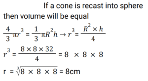 8. A cone is 32 cm high and the radius of its base is 8 cm. It is melted and recast into a sphere. Find the radius of the sphere. [RRB JE 26/05/2019 (Evening)]