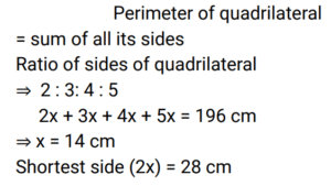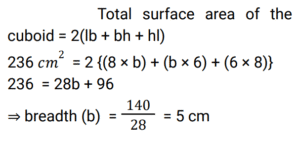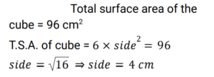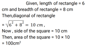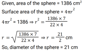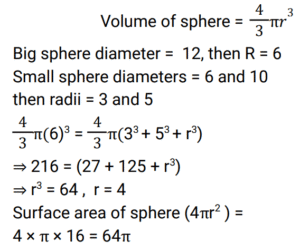 Mensuration (Railway Maths) (Part – X)Total Questions: 5041. A match box measures 3 cm × 4 cm × 5 cm. What will be the volume (in cm³) of a packet containing 12 such boxes? [ALP Tier II 21/01/2019 (Afternoon)](a) 650(b) 720(c) 600(d) 700Correct Answer: (b) 720Solution:42. The length and breadth of a rectangle are 6 cm and 8 cm respectively. What will be the area (in cm²) of a square whose side is equal to the length of the diagonal of this rectangle? [ALP Tier II 21/01/2019 (Evening)](a) 100(b) 92(c) 96(d) 196Correct Answer: (a) 100Solution:43. If the total area of a cube is 96 cm², then what is the length of the side of the cube? [ALP Tier II 21/01/2019 (Evening)](a) 3(b) 4(c) 5(d) 2Correct Answer: (b) 4Solution:44. Find the length of the diagonal of a cube whose side is 3 cm? [ALP Tier II 21/01/2019 (Morning)](a) 4.5 cm(b) 6 cm(c) 3√3 cm(d) 4 cmCorrect Answer: (c) 3√3 cmSolution:Diagonal of cube = side × √3 Side of cube(a) = 3 Then, diagonal of cube = 3√3 cm45. A solid sphere of diameter 12 cm is melted and cast into three spheres. If the diameters of two spheres are 6 cm and 10 cm respectively, then what will be the surface area (in cm²) of the third sphere? [ALP Tier II 21/01/2019 (Morning)](a) 24π(b) 48π(c) 32π(d) 64πCorrect Answer: (d) 64πSolution:46. What is the diameter (in cm) of a sphere of area 1386 cm²? [ALP Tier II 23/01/2019 (Morning)](a) 21(b) 14(c) 24.5(d) 10.5Correct Answer: (a) 21Solution:47. The total surface area of a cuboid is 236 cm 2 . Its length is 8 cm and height is 6 cm. Find its breadth (in cm). [ALP Tier II 23/01/2019 (Afternoon) ](a) 9(b) 7(c) 4(d) 5Correct Answer: (d) 5Solution:48. How many bricks will be required to build a wall of 1.6 m x 1.0 m x 20 cm, if the size of each brick is 10 cm x 8 cm x 4 cm? [ALP Tier II 08/02/2019 (Morning) ](a) 8,000(b) 6,000(c) 1,000(d) 4,000Correct Answer: (c) 1,000Solution:49. Find the area of rhombus whose diagonals are given as 25 cm and 26 cm?. (in cm²) [RPF Constable 17/01/2019 (Evening) ](a) 1326(b) 1426(c) 1126(d) 1226Correct Answer: (a) 1326Solution:50. The sides of a quadrilateral are in the ratio 2 : 3 : 4 : 5 and its perimeter is 196 cm. Find the smallest side. (in cm)? [RPF Constable 18/01/2019 (Afternoon) ](a) 27(b) 28(c) 33(d) 26Correct Answer: (b) 28Solution:Submit Quiz« Previous12345