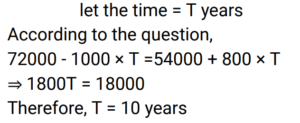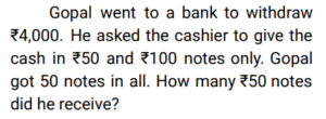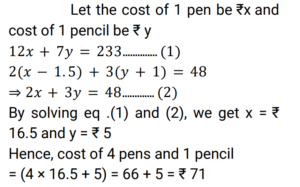 Miscellaneous (Railway Maths)Total Questions: 341. Village A has a population of 72,000, which is decreasing at the rate of 1,000 per year. Village B has a population of 54,000, which is increasing at the rate of 800 per year. In how many years will the population of both the villages be the same ? [Group D 26/08/2022 (Morning) ](a) 12(b) 15(c) 10(d) 7Correct Answer: (c) 10Solution:2. Which of the following relations would calculate the cost x of m notebooks, if the cost of n notebooks is ₹1,680. [Group D 29/08/2022 (Afternoon) ](a) x = 1680/m(b) x/m = n/m(c) m/x = 1680/n(d) m/x = n/1680Correct Answer: (d) m/x = n/1680Solution:3. There are two classrooms A and B having a certain number of students. If 5 students are shifted from A to B, then B has twice the number of students as A. If 1 student is sent from B to A, then both classrooms will have the same number of students. How many students are there in A? [Group D 30/08/2022 (Morning)](a) 17(b) 22(c) 26(d) 19Correct Answer: (a) 17Solution:4. The cost of 12 pens and 7 pencils is ₹233. If the cost of a pen decreases by ₹1.50 and the cost of a pencil increases by ₹1, then the cost of 2 pens and 3 pencils is ₹48. What is the original cost of 4 pens and 1 pencil? [Group D 02/09/2022 (Morning)](a) ₹71(b) ₹78(c) ₹77(d) ₹74Correct Answer: (a) ₹71Solution:5. Find the answer of given question? [Group D 06/09/2022 (Afternoon) ](a) 421(b) 512(c) 627(d) 375Correct Answer: (a) 421Solution:6. Gopal went to a bank to withdraw ₹4,000. He asked the cashier to give the cash in ₹50 and ₹100 notes only. Gopal got 50 notes in all. How many ₹50 notes did he receive? [Group D 08/09/2022 (Morning)](a) 24(b) 32(c) 20(d) 30Correct Answer: (c) 20Solution:7. If consumption function = 50 + 0.6Y and Investment = 20, then find the equilibrium income. [Group D 15/09/2022 (Evening) ](a) 165(b) 150(c) 200(d) 175Correct Answer: (d) 175Solution:8. A taxi charges a fixed charge of ₹40 and an additional charge per kilometre. A person pays ₹150 for 11 km of distance travelled. Find out the charges paid by Ramesh if he travelled for a distance of 20 km. [Group D 18/09/2022 (Morning)](a) ₹230(b) ₹260(c) ₹250(d) ₹240Correct Answer: (d) ₹240Solution:9. A has a certain amount of money and B also has some money. If A gives ₹130 to B, then B will have 1.5 times the amount left with A. Instead, if B gives ₹70 to A, then A will have 2 times the amount left with B. What is the total amount of money that A and B together have between them? [Group D 28/09/2022 (Evening)](a) ₹720(b) ₹750(c) ₹700(d) ₹780Correct Answer: (b) ₹750Solution:10. In a movie theater, the price of the ticket per kid is $2 while per adult it is $5. On a particular day, 2000 people bought tickets and an amount of $5,050 was collected. Find number of $2 tickets sold on that day. [Group D 29/09/2022 (Evening)](a) 1650(b) 350(c) 1560(d) 1570Correct Answer: (a) 1650Solution:Submit Quiz1234Next »