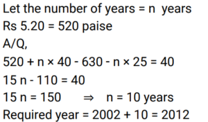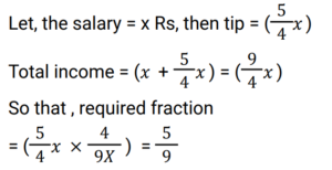 Miscellaneous (Railway Maths)Total Questions: 3411. A mango kept in a basket doubles every one minute. If the basket gets completely filled by mangoes in 30 minutes, then in how many minutes half of the basket was filled? [RRB NTPC 04/01/2021 (Morning)](a) 27(b) 15(c) 28(d) 29Correct Answer: (d) 29Solution:In every minute mangoes in the basket get doubled, so in the last minute that is in the 30th minute, it is also doubled and filled completely, which means up to 29 minutes, the basket is half filled.12. Ram has a movie in his pen drive that takes 1.75 GB of space. He wants to share it with his friends. The speed of transferring the file is 2MBs. How much time will it take to transfer the file? (1GB = 1000MB) [RRB NTPC 16/01/2021 (Morning)](a) 14 min 34 s(b) 14 min 33 s(c) 14 min 35 s(d) 14 min 36 sCorrect Answer: (c) 14 min 35 sSolution:13. If y = x/(2 + a)², then z = ? [RRB NTPC 29/01/2021 (Evening) ](a)(b)(c)(d)Correct Answer: (d)Solution:14. A beautician’s income includes her salary and the tips she gets for her services. During a particular week, if her tips were 5/4 of her salary, then what fraction of her income came from the tips? [RRB NTPC 01/02/2021 (Morning)](a) 9/5(b) 4/9(c) 5/9(d) 4/5Correct Answer: (c) 5/9Solution:15. How will you write 9.08 hours in hours, minutes and seconds? [RRB NTPC 01/02/2021 (Morning)](a) 9 hours, 8 seconds(b) 9 hours, 4 minutes, 48 seconds(c) 9 hours, 10 minutes, 8 seconds(d) 9 hours, 8 minutesCorrect Answer: (b) 9 hours, 4 minutes, 48 secondsSolution:9.08 hours in hours = 9 hours + 0.08 hours = 9 hours 4 min 48 sec. Where - 60 min. = 1 hours, 60 sec.= 1 min.16. A competitive exam is to be held on a particular day. The examiner who has to supervise the exam enters the examination room 30 minutes before 2:30 hours. He came 40 minutes before the student who was 20 minutes late for the exam. At what time will the examination start? [RRB NTPC 10/02/2021 (Morning)](a) 2:40 hours(b) 2:20 hours(c) 3:00 hours(d) 2:00 hoursCorrect Answer: (b) 2:20 hoursSolution:17. If the first term of a geometric progression is 2 and the common ratio is 3, then what will be the fifth term of the geometric progression? [RRB NTPC 22/02/2021 (Morning)](a) 162(b) 243(c) 81(d) 324Correct Answer: (a) 162Solution:18. When notebooks are distributed in a class, each child gets notebooks equivalent to one-eighth of the number of children in the class. If the number of children were halved, then each child would get 16 notebooks. How many notebooks are distributed in total? [RRB NTPC 11/03/2021 (Evening)](a) 512(b) 452(c) 632(d) 256Correct Answer: (a) 512Solution:19. The electricity bill of an establishment is partly fixed and partly varies as per the number of units of electricity consumed. In a certain month, when 480 units were consumed, then the bill was Rs. 1,620. In another month, when 690 units were consumed, then the bill was Rs. 2,250. In the next month, if 500 units are consumed, then the bill for that month will be: [RRB NTPC 11/03/2021 (Evening)](a) Rs. 1,560(b) Rs. 1,840(c) Rs. 1,680(d) Rs. 1,950Correct Answer: (c) Rs. 1,680Solution:20. The price of commodity X increases by 40 paise every year, while the price of commodity Y increases by 25 paise every year. If, in the year 2002, the price of X was Rs. 5.20 and that of Y was Rs. 6.30, then in which year would commodity X cost 40 paise more than commodity Y ? [RRB NTPC 11/03/2021 (Evening) ](a) 2011(b) 2010(c) 2013(d) 2012Correct Answer: (d) 2012Solution:Submit Quiz« Previous1234Next »