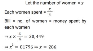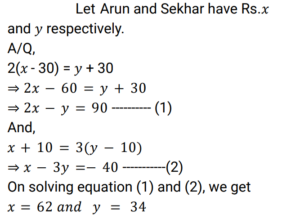 Miscellaneous (Railway Maths)Total Questions: 3421. From certain number of apples, a man sells 1/3 of the apples to the first customer. He sells 1/2 of the remaining apples to the second customer, and 1/3 of the remaining apples plus 5 to the third customer. He then finds himself left with 3 apples. How many apples did the man have initially? [RRB NTPC 14/03/2021 (Evening)](a) 24(b) 30(c) 36(d) 18Correct Answer: (c) 36Solution:22. If the price of Bitcoin increases at the rate of one dollar every 20 seconds, then by how many dollars does the price of Bitcoin increase in half an hour? [RRB NTPC 01/04/2021 (Evening)](a) $80(b) $50(c) $90(d) $10Correct Answer: (c) $90Solution:23. There are 20 pigeons, 10 cows, 15 dogs and some buffaloes. If the total number of feet is 125 more than the heads, then what is the number of buffaloes? [RRB NTPC 03/04/2021 (Morning)](a) 8(b) 5(c) 10(d) 15Correct Answer: (c) 10Solution:24. What is the value of k in the following Arithmetic progression? 15 + 13 + 11 + 9 + ... + k = -105 [RRB NTPC 08/04/2021 (Evening)](a) -21(b) 7(c) -25(d) -5Correct Answer: (c) -25Solution:25. In a competition, two points are awarded for a win, one point for a draw, and no points for a loss. Fischer played 20 matches in which he drew three matches, lost at least one, and won at least one match. What will be his maximum and minimum possible marks respectively? [RRB NTPC 23/07/2021 (Morning)](a) 25 and 15(b) 40 and 0(c) 35 and 5(d) 33 and 8Correct Answer: (c) 35 and 5Solution:Maximum points = 16 win + 3 draw +1 lost = 32 + 3 = 35 points Minimum points = 1 win + 3 draw + 16 lost = 2 + 3 = 5 points26. If 9 × log(x) = log (9) + log (27) + log (81), then x = ? [RRB NTPC 24/07/2021 (Morning) ](a) 4(b) 2(c) 1(d) 3Correct Answer: (d) 3Solution:27. A certain number of women went to a hotel. Each woman spent as many rupees as one-fourth of the number of women. If the total bill paid was Rs. 20,449, then how many women visited the hotel? [RRB NTPC 31/07/2021 (Morning) ](a) 286(b) 284(c) 281(d) 283Correct Answer: (a) 286Solution:28. Arun and Sekhar have certain amounts of money. If Arun gives Rs. 30 to Sekhar, then Sekhar will have twice the amount left with Arun. If Sekhar gives Rs. 10 to Arun, then Arun will have thrice as much as is left with Sekhar. What amount (in Rs.) does each of Arun and Shekhar respectively have in the beginning ? [RRB NTPC 31/07/2021 (Evening) ](a) 34, 62(b) 56, 78(c) 34, 72(d) 62, 34Correct Answer: (d) 62, 34Solution:29. If A, B are two mutually exclusive events, then find P(A ∪ B). [RRB JE 30/05/2019 (Evening)](a) P(A) + P(B)(b) P(A) × P(B)(c) P(A) + P(B) - P(A ∩ B)(d) 1 - P(A) - P(B)Correct Answer: (a) P(A) + P(B)Solution:30. A boy was asked to write the value of (2)⁵ × (8)². He wrote it as 2582. Find the difference between the obtained and the actual value. [RRB JE 31/05/2019 (Evening)](a) 189(b) 0(c) 37(d) 534Correct Answer: (d) 534Solution:Submit Quiz« Previous1234Next »