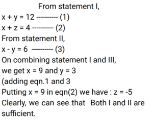 Miscellaneous (Railway Maths)Total Questions: 3431. The ratio of the numbers of blue to red balls in a bag is constant. When there were 44 red balls, the number of blue balls was 36. If the number of blue balls is 54, how many red balls will be in the bag? [RRB ALP 09/08/2018 (Morning)](a) 62(b) 68(c) 66(d) 64Correct Answer: (c) 66Solution:32. Which of the following statement is sufficient to answer the question? Find the values of x, y, z from the given statements. [RRB ALP 20/08/2018 (Evening)]Statements: I : x + y = 12 ; x + z = 4 II : x - y = 6(a) Only I is sufficient while II is not(b) Both I and II are sufficient(c) Only II is sufficient while I is not(d) Neither I nor II is sufficientCorrect Answer: (b) Both I and II are sufficientSolution:33. In the usual set notation, A ∪ (B ∩ C) = [RRB ALP 29/08/2018 (Afternoon)](a) (A ∪ B) ∩ (A ∩ C)(b) (A ∩ B) ∪ (A ∩ C)(c) (A ∪ B) ∪ (A ∪ C)(d) (A ∪ B) ∩ (A ∪ C)Correct Answer: (d) (A ∪ B) ∩ (A ∪ C)Solution:34. When 472 pieces of plywood, each 0.23cm thick, are piled on top of each other, what would be the height of the pile in metre? [RRB ALP 29/08/2018 (Evening) ](a) 1.856(b) 10.856(c) 108.56(d) 1.0856Correct Answer: (d) 1.0856Solution:Submit Quiz« Previous1234