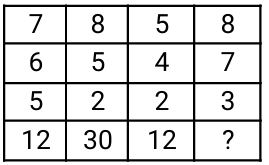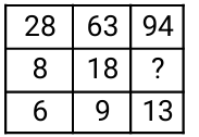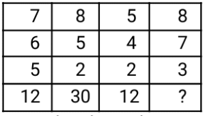 Missing Number – Railway Reasoning part – 1Total Questions: 5041. Find the missing number to complete the following sequence: [Level 2 (13/06/2022) Shift 1]11, 8, 5 , 2 = 3 19, 14, 9 , 4 = 5 27, 20, 13, 6 = ?(a) 11(b) 13(c) 9(d) 7Correct Answer: (d) 7Solution:Logic : - Difference between consecutive numbers in row = ? 11, 8, 5, 2 = 3 11 - 8 = 3, 5 - 2 = 3 19, 14, 9, 4 = 5 19 - 14 = 5, 9 - 4 = 5 Similarly, 27, 20, 13, 6 27 - 20 = 7, 13 - 6 = 742. Find the missing number to complete the following sequence: [Level 2 (13/06/2022) Shift 2]36, 58, 21 = 23 41, 39, 20 = 20 39, 52, 34 = ?(a) 17(b) 30(c) 25(d) 15Correct Answer: (c) 25Solution:36 + 58 + 21 = 115 ÷ 5 = 23 41 + 39 + 20 = 100 ÷ 5 = 20 Similarly, 39 + 52 + 34 = 125 ÷ 5 = 2543. Find the missing number to complete the following sequence: [Level 5 (15/06/2022) Shift 1]69, 87 = 39 93, 95 = 47 52, 64 = ?(a) 29(b) 37(c) 45(d) 53Correct Answer: (a) 29Solution:69, 87 = 39 ⇒ (69 + 87)/4 = 39 93, 95 = 47 ⇒ (93 + 95)/4 = 47 52, 64, = ? ⇒ (52 + 64)/4 = 2944. Find the missing number to complete the following sequence: [Level 2 (16/06/2022) Shift 2]6, 8 = 12 9, 8 = 18 6, 10 = ?(a) 18(b) 17(c) 16(d) 15Correct Answer: (d) 15Solution:45. Find the missing number to complete the following sequence: [RRB NTPC 28/12/2020 (Morning)](a) 69(b) 75(c) 76(d) 48Correct Answer: (b) 75Solution:Here the pattern is,For the first column ⇒ (28 + 8) = 36 = 6²For the second column ⇒ (63 + 18) = 81 = 9² Similarly, For the third column ⇒ (94 + x) = 13² = 169⇒ x = (169 - 94) = 75So, the missing number = 75.46. Find the missing number to complete the following sequence: [RRB NTPC 30/12/2020 (Morning)](a) 10(b) 16(c) 20(d) 18Correct Answer: (c) 20Solution:In the first column, the difference between the first and second number is equal to the difference between the third and fourth number = [(14 - 10) = (12 - 8) = 4]Similarly, for the second column= [(12 - 8) = (18 - 14) = 4]Similarly, for the third column= [(10 - 2) = (14 - 6) = 8]Similarly, for the fourth column= [(8 - 4) = (? - 16)] ⇒ ? = 2047. Find the missing number to complete the following sequence: [RRB NTPC 30/12/2020 (Evening)](a) 338(b) 296(c) 284(d) 352Correct Answer: (d) 352Solution:For the first row, 5³ + 4² = 125 + 16 = 141 for the second row, 6³ + 2² = 216 + 4 = 220 Similarly, for the third row, 7³ + 3² = 343 + 9 = 35248. Find the missing number to complete the following sequence: [RRB NTPC 30/12/2020 (Evening)](a) 24(b) 35(c) 49(d) 28Correct Answer: (b) 35Solution:From the above diagram,In the first column, (7 - 5) × 6 = 12In the second column , (8 - 2) × 5 = 30In the third column, (5 - 2) × 4 = 12So, in the fourth column, (8 - 3) × 7 = 3549. If 243 (222) 317, then 548 (?) 621 [RRB NTPC 05/01/2021 (Morning)](a) 211(b) 209(c) 210(d) 219Correct Answer: (d) 219Solution:Given, 243 (222) 317,i.e.{(317 - 243) × 3} = 74 × 3 = 222Then, 548 (?) 621 ⇒= {(621 — 548) × 3} = 73 × 3 = 219So, the pattern will be 548 (219) 621.50. Find the missing number to complete the following sequence: [RRB NTPC 05/01/2021 (Evening)](a) 50(b) 54(c) 42(d) 40Correct Answer: (c) 42Solution:30 - 12 + 2 = 2042 - 14 + 2 = 3056 - 16 + 2 = 42Submit Quiz« Previous12345