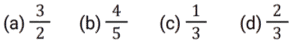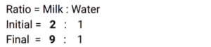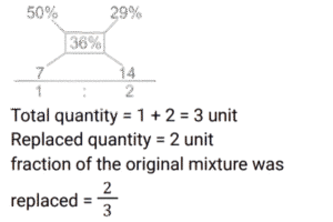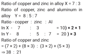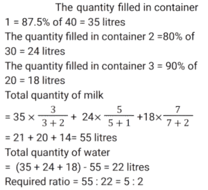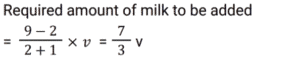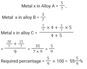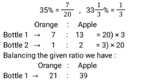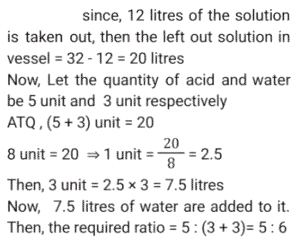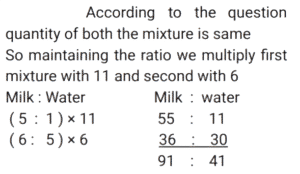 Mixture and AlligationTotal Questions: 5011. In a solution of water and milk, the quantity of milk is double the quantity of water. To pass the quality standards, the solution must contain 90% milk in it. If the volume of the solution is v, then how much pure milk in litres is to be added to the solution to pass the quality standard. [SSC CHSL 02/08/2023 (2nd Shift)](a)(b)(d)(c)Correct Answer: (d)Solution: 12. Alloy X contains 70% copper and 30% zinc. Alloy Y contains 40% copper, 25% zinc and 35% aluminum. Alloy X and Y are mixed in the ratio of 1 : 3. What is the ratio of copper and zinc in the newly formed alloy ? [SSC MTS 17/05/2023 (Afternoon)](a) 38 : 21(b) 11 : 32(c) 19 : 33(d) 19 : 21Correct Answer: (a) 38 : 21Solution:13. A jar contains a mixture of milk and water, having 50% water. A part of this mixture is replaced by another mixture having 29% water. The percentage of water in the jar after replacement is 36%. What fraction of the original mixture was replaced ? [SSC MTS 10/05/2023 (Afternoon)](a)(b)(c)(d)Correct Answer: (d)Solution:14. Two vessels of equal capacity, and both completely filled, contain mixtures of milk and water in the ratio 5 : 1 and 6 : 5, respectively. Both the mixtures are now mixed thoroughly. What is the ratio of milk to water in the new mixture so obtained ? [SSC MTS 13/07/2022 (Evening)](a) 91 : 41(b) 57 : 41(c) 105 : 67(d) 28 : 43Correct Answer: (a) 91 : 41Solution:15. Babulal runs a juice corner outside a park and sells giloy juice (giloy + water) in the morning. Initially he had 19 litres of juice, which had giloy and water in the ratio 2 : 9. He sold 2½ liters of juice Later, in order to dilute it, he added some water and the ratio of giloy and water became 1 : 5. How much water was added ? [SSC MTS 27/10/2021 (Morning)](b)(a)(c)(d)Correct Answer: (a)Solution:16. Alloy A contains metal x and y only in the ratio 5 : 2 and alloy B contains these metals in the ratio 3 : 4. Alloy C is prepared by mixing A and B in the ratio 4 : 5. The percentage of x in alloy C is: [SSC CGL Tier II (16/11/2020)](a)(b)(c)(d)Correct Answer: (d)Solution:17. Two bottles of same capacity are 35% and 33⅓% full of orange juice respectively. They are filled up completely with apple juice and then the contents of both bottles are emptied into another vessel. The percentage of apple juice in the mixture is: [SSC CGL 03/03/2020 (Afternoon)](a)(b)(d)(c)Correct Answer: (d)Solution: 18. A vessel contains a 32 litre solution of acid and water in which the ratio of acid and water is 5 : 3. If 12 litres of the solution are taken out and 7½ litres of water are added to it, then what is the ratio of acid and water in the resulting solution ? [SSC CGL Tier II (13/09/2019)](b) 5 : 6(a) 4 : 7(c) 4 : 9(d) 8 : 11Correct Answer: (b) 5 : 6Solution:19. The ratios of copper to Zinc in alloys A and B are 3 : 4 and 5 : 9 respectively. A and B are taken in the ratio 2 : 3 and melted to form a new alloy C. What is the ratio of copper to Zinc in C ? [SSC CGL Tier II (11/09/2019)](a) 27 : 43(b) 3 : 5(c) 9 : 11(d) 8 : 13Correct Answer: (a) 27 : 43Solution:20. A milkman uses three containers for selling milk, their capacities being 40L, 30L and 20L respectively. He fills respectively 87.5%, 80% and 90% of the containers with a mix of milk and water in the ratios, 3 : 2, 5 : 1 and 7 : 2 respectively. What is the ratio of total quantity of milk to that of water carried by him ? [SSC CHSL 10/07/2019 (Evening)](a) 7 : 2(b) 31 : 12(c) 5 : 2(d) 35 : 9Correct Answer: (c) 5 : 2Solution:Submit Quiz« Previous12345Next »