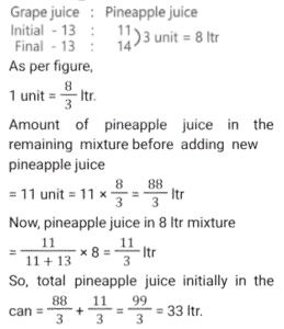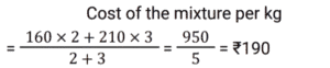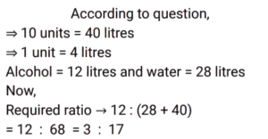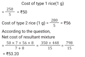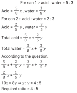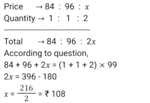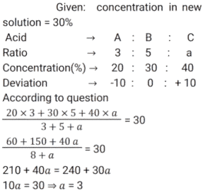 Mixture and AlligationTotal Questions: 5021. Fresh fruit contains 68% water and dry fruit contains 20% water. How much dry fruit can be obtained from 100 kg of fresh fruit [SSC CPO 16/03/2019 (Morning)](a) 80(b) 60(c) 20(d) 40Correct Answer: (d) 40Solution:22. If two kinds of resins costing ₹160 per kg and ₹210 per kg are mixed in the ratio of 2 : 3, then find the cost (in ₹) of the mixture per kg. [SSC MTS 17/10/2024 (Evening)](a) 185(b) 180(c) 200(d) 190Correct Answer: (d) 190Solution:23. A chef has two cans of acids and water mixture. He combines the contents of both cans in a beaker. The resulting mixture has half water and half acid. What is the quantity in which he mixed the contents of can 1 and can 2, given that can 2 has an acid-to-water ratio of 2 : 3 and can 1 has an acid-to-water ratio of 5 : 3 ? [SSC MTS 18/10/2024 (Afternoon)](a) 2 : 3(b) 4 : 7(c) 4 : 5(d) 3 : 7Correct Answer: (c) 4 : 5Solution:24. A vessel contains 80 litres of a mixture of alcohol and water in the ratio of 3 : 7. If 40 litres of the mixture is taken out from the vessel and replaced with 40 litres of water, then the ratio of alcohol and water becomes: [SSC MTS 21/10/2024 (Morning)](a) 3 : 23(b) 1 : 11(c) 3 : 17(d) 2 : 15Correct Answer: (c) 3 : 17Solution:25. A can contains a mixture of two liquids, grape juice and pineapple juice in the ratio 13 : 11. When 8 litres of the mixture is drawn off, and the can is filled with pineapple juice, the ratio becomes 13 : 14. How many litres of pineapple juice was initially contained in the can ? [SSC MTS 21/10/2024 (Afternoon)](a) 14 litres(b) 28 litres(c) 11 litres(d) 33 litresCorrect Answer: (d) 33 litresSolution:26. A shopkeeper of a subsidised canteen mixed three varieties of rice, X, Y and Z, in the ratio of 4 : 1 : 3 to make a packet of 4 kg of rice. The cost prices per kg of X, Y and Z varieties of rice are ₹2, ₹4 and ₹6, respectively. What is the cost price (in ₹) of the packet of rice ? [SSC MTS 13/11/2024 (Morning)](a) 15(b) 10(c) 30(d) 18Correct Answer: (a) 15Solution:27. Rice worth ₹84 per kg and ₹96 per kg is mixed with a third variety of rice in the ratio 1 : 1 : 2. If the mixture is worth ₹99 per kg, the price of the third variety per kg is: [SSC MTS 14/11/2024 (Afternoon)](a) ₹108(b) ₹115(c) ₹112(d) ₹110Correct Answer: (a) ₹108Solution:28. The concentrations of three acids, A, B, and C, are specified as 20%, 30%, and 40%, respectively. They are blended in a ratio of 3 : 5 : a, yielding a solution with a concentration of 30%. What is the value of 'a' ? [SSC CGL 10/09/2024 (2nd Shift)](a) 4(b) 1(c) 2(d) 3Correct Answer: (d) 3Solution:29. A merchant mixes two varieties of sugar of 5 kg and 3 kg, which costs him ₹4 and ₹6 per kg, respectively. What is the cost price (in ₹) of the mixture per kg [SSC CGL 12/09/2024 (3rd Shift)](a) 4.35(b) 4.45(c) 4.21(d) 4.75Correct Answer: (d) 4.75Solution:30. A shopkeeper mixes two types of rice costing ₹250/5 kg and ₹280/5 kg in the ratio 7 : 8. Find the net cost of the resultant mixture (per kg). [SSC CGL 13/09/2024 (1st Shift)](a) ₹32.50(b) ₹53.20(c) ₹52.30(d) ₹25.30Correct Answer: (b) ₹53.20Solution:Submit Quiz« Previous12345Next »