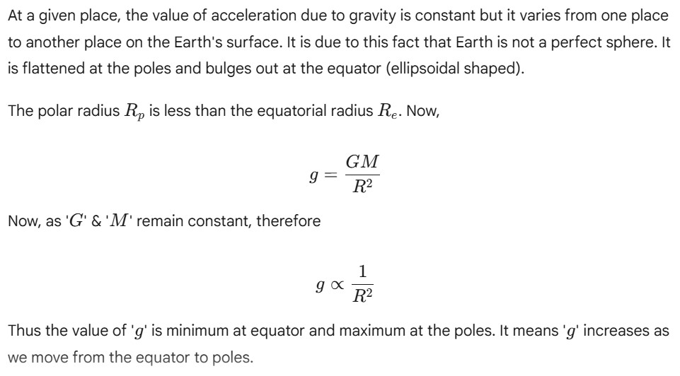 Solution:The weight of a body on the Earth is the amount of gravitational pull on it exerted by the Earth. Due to Earth's rotation, centrifugal force also exerted on a body on Earth, which tries to move the body away from the centre of the Earth. At the equator, centrifugal force is maximum as the velocity of rotation is maximum at the equator of the Earth.