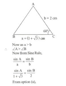 2. In a triangle ABC, a = (1 + √3) cm, b = 2 cm and angle C = 60°. Then the other two angles are