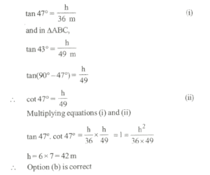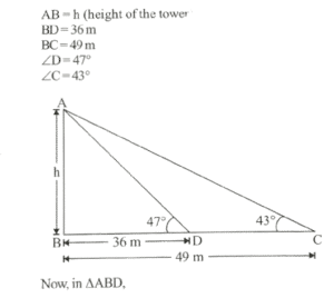 7. The angles of elevation of the top of a tower standing on a horizontal plane from two points on a line passing through the foot of the tower at distances 49 m and 36 m are 43° and 47° respectively. What is the height of the tower?