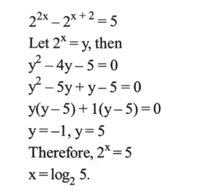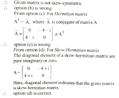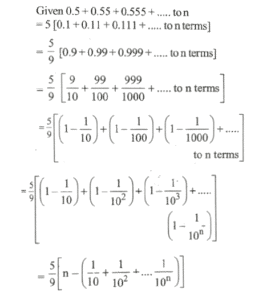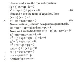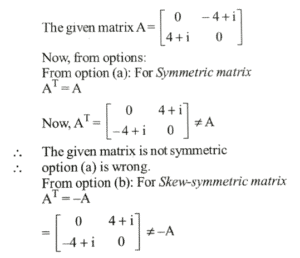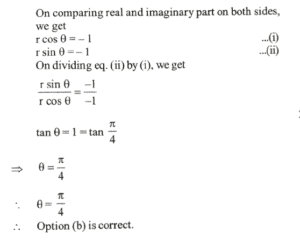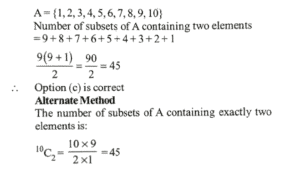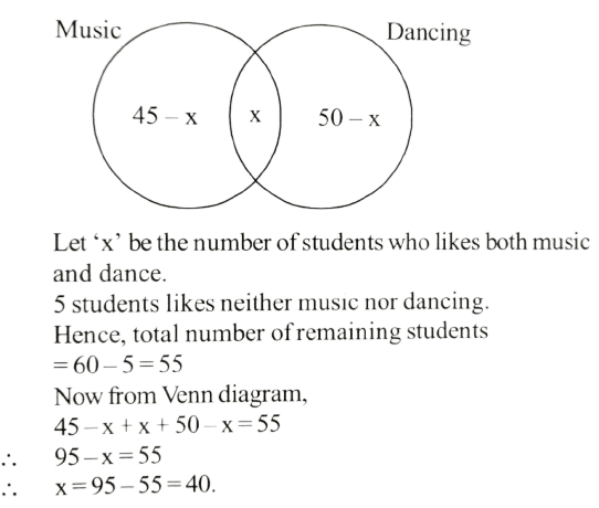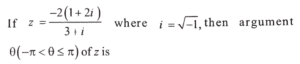 NDA/NA SOLVED PAPER 2015-I (MATHEMATICS)Total Questions: 12021. In a class of 60 students, 45 students like music, 50 students like dancing, 5 students like neither. Then the number of students in the class who like both music and dancing is(a) 35(b) 40(c) 50(d) 55Correct Answer: (b) 40Solution:22. If log₁₀ 2 log₁₀ (2ˣ - 1) and log₁₀ (2ˣ + 3) are three consecutive terms of an A.P, then the value of x is(a) 1(b) log₅ 2(c) log₂ 5(d) log₁₀ 5Correct Answer: (c) log₂ 5Solution: 23. Solve the following equation(a) symmetric(b) skew-symmetric(c) Hermitian(d) skew-HermitianCorrect Answer: (d) skew-HermitianSolution: 24. Let Z be the set of integers and aRb, where a, b ∈ Z if and only if (a - b) is divisible by 5.Consider the following statements: 1. The relation R partitions Z into five equivalent classes. 2. Any two equivalent classes are either equal or disjoint.Which of the above statements is/are correct?(a) 1 only(b) 2 only(c) Both 1 and 2(d) Neither 1 nor 2Correct Answer: (c) Both 1 and 225. Solve the following equation(a) 3π/4(b) π/4(c) 5π/6(d) - 3π/4Correct Answer: (d) - 3π/4Solution: 26. If m and n are the roots of the equation (x + p)(x + q) - k = 0, then the roots of the equation (x - m)(x - n) + k = 0 are(a) Pand q(b) 1/p and 1/q(c) -p and -9(d) p + q qandp p - qCorrect Answer: (c) -p and -9Solution:27. What is the sum of the series 0.5 + 0.55 + 0.555 +... to n terms?(a)(b)(c)(d)Correct Answer: (d)Solution: 28. If 1, ω , ω² are the cube roots of unity, then the value of (1 + omega) (1 + ω²) (1 + ω⁴) (1 + ω⁸) is(a) -1(b) 0(c) 1(d) 2Correct Answer: (c) 1Solution:29. Let A = {1, 2, 3, 4, 5, 6, 7, 8, 9, 10} Then the number of subsets of A containing exactly two elements is(a) 20(b) 40(c) 45(d) 90Correct Answer: (c) 45Solution:30. What is the square root of i, where i = √-1 ?(a) (1 + i)/2(b) (1 - i)/2(c) (1 + i)/√2(d) None of theseCorrect Answer: (c) (1 + i)/√2Solution: Submit Quiz« Previous123456789101112Next »