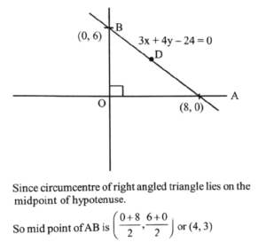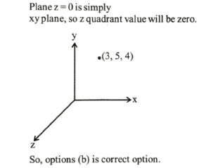 NDA/NA SOLVED PAPER 2015-II (MATHEMATICS)Total Questions: 12051. The line 3x + 4y - 24 = 0 intersects the x-axis at A and y-axis at B. Then the circumcentre of the triangle OAB where O is the origin is(a) (2, 3)(b) (3, 3)(c) (4, 3)(d) None of the aboveCorrect Answer: (c) (4, 3)Solution:52. The eccentricity of the hyperbola 16x² - 9y² = 1 is(a) 3/5(b) 5/3(c) 4/5(d) 5/4Correct Answer: (b) 5/3Solution:53. The product of y the perpendiculars from the two points (± 4, 0) to the line 3x cos φ + 5y sin φ = 15 is(a) 25(b) 16(c) 9(d) 8Correct Answer: (c) 9Solution: 54. If the centre of the circle passing through the origin is (3, 4), then the intercepts cut off by the circle on x-axis and y-axis respectively are(a) 3 unit and 4 unit(b) 6 unit and 4 unit(c) 3 unit and 8 unitIf the centre of the circle passing through the origin is (3, 4), then the intercepts cut off by the circle on x-axis and y-axis respectively areCorrect Answer: If the centre of the circle passing through the origin is (3, 4), then the intercepts cut off by the circle on x-axis and y-axis respectively areSolution:55. The lines 2x = 3y = - z and 6x = - y = - 4z(a) are perpendicular(b) are parallel(c) intersect at an angle 45°(d) intersect at an angle 60°Correct Answer: (a) are perpendicularSolution:56. Two straight lines passing through the point A(3, 2) cut the line 2y = x + 3 and x-axis perpendicularly at P and Q respectively. The equation of the line PQ is(a) 7x + y - 21 = 0(b) x + 7y + 21 = 0(c) 2x + y - 8 = 0(d) x + 2y + 8 = 0Correct Answer: (a) 7x + y - 21 = 0Solution:57. The radius of the sphere 3x² + 3y² + 3z² - 8x + 4y + 8z - 15 = 0 is(a) 2(b) 3(c) 4(d) 5Correct Answer: (b) 3Solution:58. The direction ratios of the line perpendicular to the lines with direction ratios and are(a)(b)(c)(d)Correct Answer: (a)Solution:59. What are the co-ordinates of the foot of the perpendicular drawn from the point (3, 5, 4) on the plane z = 0 ?(a) (0, 5, 4)(b) (3, 5, 0)(c) (3, 0, 4)(d) (0, 0, 4)Correct Answer: (b) (3, 5, 0)Solution:60. The lengths of the intercepts on the co-ordinate axes made by the plane 5x + 2y + z - 13 = 0 are(a) 5, 2, 1 unit(b) 13/5, 13/2, 13 unit(c) 5/13, 2/13, 1/13 unit(d) 1, 2, 5 unitCorrect Answer: (b) 13/5, 13/2, 13 unitSolution:Submit Quiz« Previous123456789101112Next »