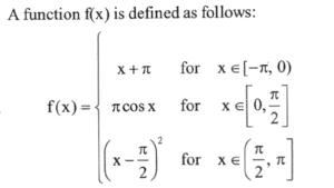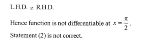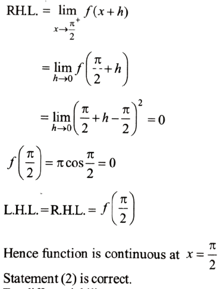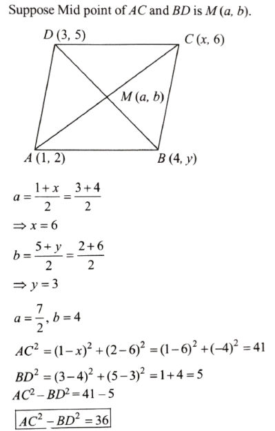 NDA/NA SOLVED PAPER 2016-I (MATHEMATICS)Total Questions: 12051. Which one of the following is correct?(a) in AP only(b) in GP only(c) in both AP and GP(d) neither in AP nor in GPCorrect Answer: (c) in both AP and GPSolution:Similarly xy, yz, zx are also in A.P. and G.P. both.52. What is |z| equal to?(a) 6(b) 12(c) 18(d) 36Correct Answer: (a) 6Solution:53. Solve the following equation(a) 3(b) 2(c) 1(d) 0Correct Answer: (d) 0Solution:54. Consider the following statements: 1. The function f(x) is continuous at x = 0. 2. The function f(x) is continuous at x = π/2.Which of the above statements is/are correct?(a) 1 only(b) 2 only(c) Both 1 and 2(d) Neither 1 nor 2Correct Answer: (c) Both 1 and 2Solution: 55. Consider the following statements: 1. The function f(x) is differentiable at x = 0 . 2. The function f(x) is differentiable at x = π/2Which of the above statements is/are correct ?(a) 1 only(b) 2 only(c) Both 1 and 2(d) Neither 1 nor 2Correct Answer: (d) Neither 1 nor 2Solution: 56. Consider the following:Let α and ẞ beta(α < β) be the roots of the equation x² + bx + c = 0 where b > 0 and c < 0 .1. ẞ < -α 2. ẞ < |α|Which of the above is/are correct?(a) 1 only(b) 2 only(c) Both 1 and 2(d) Neither 1 nor 2Correct Answer: (c) Both 1 and 2Solution:57. Consider the followingLet α and ẞ beta(α < β) be the roots of the equation x² + bx + c = 0 where b > 0 and c < 0 .1. α + β + α β > 0 2. α² β + β² α > 0Which of the above is/are correct?(a) 1 only(b) 2 only(c) Both 1 and 2(d) Neither 1 nor 2Correct Answer: (b) 2 onlySolution:58. What is the value of AC² - BD² ?Consider a parallelogram whose vertices are A(1, 2) B (4, y), C(x,6) and D (3, 5) taken in order.(a) 25(b) 30(c) 36(d) 40Correct Answer: (c) 36Solution:59. What is the point of intersection of the diagonals?Consider a parallelogram whose vertices are A(1, 2) B (4, y), C(x,6) and D (3, 5) taken in order.(a) (7/2, 4)(b) (3,4)(c) (7/2, 5)(d) (3, 5)Correct Answer: (a) (7/2, 4)Solution:Point of intersection (a, b) is (7/2, 4) .60. What is the area of the parallelogram ?Consider a parallelogram whose vertices are A(1, 2) B (4, y), C(x,6) and D (3, 5) taken in order.(a) 7/2 square units(b) 4 square units(c) 11/2 square units(d) 7 square unitsCorrect Answer: (d) 7 square unitsSolution: Submit Quiz« Previous123456789101112Next »