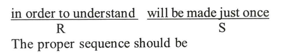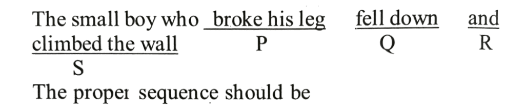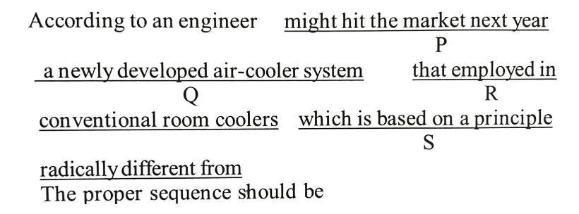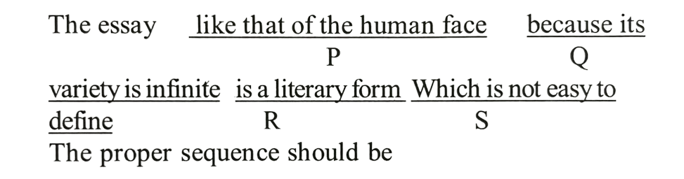 NDA/NA SOLVED PAPER 2016-II (ENGLISH)Total Questions: 5031. (Questions 31-37) Each of the following items in this section consists of a sentence the parts of which have been jumbled. These parts have been labelled P, Q, R and S. Given below each sentence are four sequences namely (a), (b), (c) and (d). You are required to rearrange the jumbled parts of the sentence and mark your response accordingly. (a) SPRQ(b) SRQP(c) RSPО(d) SPQRCorrect Answer: (a) SPRQ32. You are required to rearrange the jumbled parts of the sentence and mark your response accordingly.(a) PSRQ(b) SQRP(c) QSRP(d) SPRQCorrect Answer: (b) SQRP33. You are required to rearrange the jumbled parts of the sentence and mark your response accordingly.(a) SQRP(b) RSQP(c) QSRP(d) PQRSCorrect Answer: (c) QSRP34. You are required to rearrange the jumbled parts of the sentence and mark your response accordingly.(d) QPSR(a) SRQP(b) QRSP(c) PQRSCorrect Answer: (d) QPSR35. You are required to rearrange the jumbled parts of the sentence and mark your response accordingly.(a) PQRS(b) RSPQ(c) RPQS(d) PRSQCorrect Answer: (d) PRSQ36. You are required to rearrange the jumbled parts of the sentence and mark your response accordingly.(a) PQRS(b) PQSR(c) RSQP(d) RSPQCorrect Answer: (c) RSQP37. You are required to rearrange the jumbled parts of the sentence and mark your response accordingly.(a) QSRP(b) SRQP(c) QPSR(d) SPQRCorrect Answer: (b) SRQP38. (Questions 38-40) Look at the underlined part of each sentence. Below each sentence are given three possible substitutions for the underlined part. If one of them (a), (b) or (c) is better than the underlined part, indicate your response on the Answer Sheet against the corresponding letter (a), (b) or (c). If none of the substitutions improves the sentence, indicate (d) as your response on the Answer Sheet Thus a "No improvement" response will be signified by the letter (d).My old teacher gave many poor students money in spite of he was poor.(a) even though(b) as if(c) however(d) NO IMPROVEMENTCorrect Answer: (a) even though39. Choose the best substitute (a, b, c) for the underlined part in each sentence.You should to read the newspapers regularly if you want to be well informed.(a) ought(b) have to(c) should be(d) NO IMPROVEMENTCorrect Answer: (b) have to40. Choose the best substitute (a, b, c) for the underlined part in each sentence.If he had listening to me he would not have got lost.(a) listened me(b) listened to me(c) listen me(d) NO IMPROVEMENTCorrect Answer: (b) listened to meSubmit Quiz« Previous12345Next »