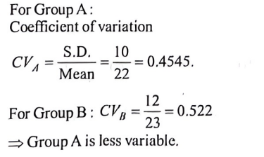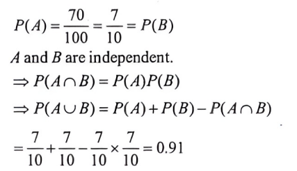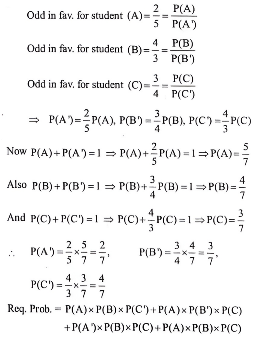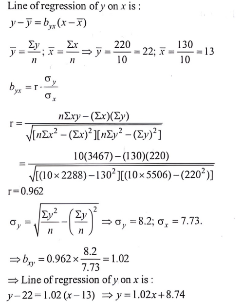 NDA/NA SOLVED PAPER 2016-II (MATHEMATICS)Total Questions: 120101. A special dice with numbers 1, -1, -2, -2, 0 and 3 is thrown thrice. What is the probability that the sum of the numbers occurring on the upper face is zero?(a) 1/72(b) 1/8(c) 7/72(d) 25/216Correct Answer: (d) 25/216Solution: 102. There is 25% chance that it rains on any particular day. What is the probability that there is at least one rainy day within a period of 7 days?(a)(b)(c)(d)Correct Answer: (d)Solution:103. A salesman has a 70% chance to sell a product to any customer. The behaviour of successive customers is independent. If two customers A and B enter, what is the probability that the salesman will sell the product to customer A or B?(a) 0.98(b) 0.91(c) 0.70(d) 0.49Correct Answer: (b) 0.91Solution:104. A student appears for tests I, II and III. The student is considered successful if he passes in tests I, II or III or all the three. The probabilities of the student passing in tests I, II and III are m, n and 1/2 respectively. If the probability of the student to be successful is 1/2, then which one of the following is correct?(a) m(1 + n) = 1(b) n(1 + m) = 1(c) m = 1(d) mn = 1Correct Answer: (a) m(1 + n) = 1Solution:105. Three candidates solve a question. Odds in favour of the correct answer are 5:2, 4:3 and 3:4 respectively for the three candidates. What is the probability that at least two of them solve the question correctly?(a) 209/343(b) 134/343(c) 149/343(d) 60/343Correct Answer: (a) 209/343Solution: 106. Consider the following statements:1. The mean and median are equal in symmetric distribution. 2. The range is the difference between the maximum value and the minimum value in the data. 3. The sum of the areas of the rectangles in the histogra is equal to the total area bounded by the frequency polygon and the horizontal axis.Which of the above statements are correct?(a) 1 and 2 only(b) 2 and 3 only(c) 1 and 3 only(d) 1, 2 and 3Correct Answer: (d) 1, 2 and 3Solution:Mean = Median (in symmetric distribution) Range= (Max. value -Min. value) And sum of areas of rectangles in the histogram is always equal to the total area bounded by frequency polygon and the horizontal axis.107. The scores of 15 students in an examination were recorded as 10, 5, 8, 16, 18, 20, 8, 10, 16, 20, 18, 11, 16, 14 and 12. After calculating the mean, median and mode, an error is found. One of the values is wrongly written as 16 instead of 18. Which of the following measures of central tendency will change?(a) Mean and median(b) Median and mode(c) Mode only(d) Mean and modeCorrect Answer: (d) Mean and modeSolution:Mean of the scores = 202/15 Mean of the correct scores = 200/15 i.e., Mean changes. Median is same for both cases i.e., 14. Mode is proportional to mean.108. For 10 observations on price (x) and supply (y), the following data was obtained :(a) y = 0.91x + 8.74(b) y = 1.02x + 8.74(c) y = 1.02x - 7.02(d) y = 0.91x - 7.02Correct Answer: (b) y = 1.02x + 8.74Solution:109. In a study of two groups, the following results were obtained:GroupGroupABSample Size2025Sample mean2223Sample standard deviation1012Which of the following statements is correct?(a) Group A is less variable than Group B because Group A's standard deviation is smaller.(b) Group A is less variable than Group B because Group A's sample size is smaller.(c) Group A is less variable than Group B because Group A's sample mean is smaller.(d) Group A is less variable than group B because Group A's coefficient of variation is smaller.Correct Answer: (d) Group A is less variable than group B because Group A's coefficient of variation is smaller.Solution:110. Consider the following statements in respect of class intervals of grouped frequency distribution:1. Class intervals need not be mutually exclusive. 2. Class intervals should be exhaustive. 3. Class intervals need not be of equal width.Which of the above statements are correct?(a) 1 only 2 only(b) 2 and 3 only(c) 1 and 3 only(d) 1,2 and 3Correct Answer: (b) 2 and 3 onlySubmit Quiz« Previous123456789101112Next »