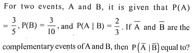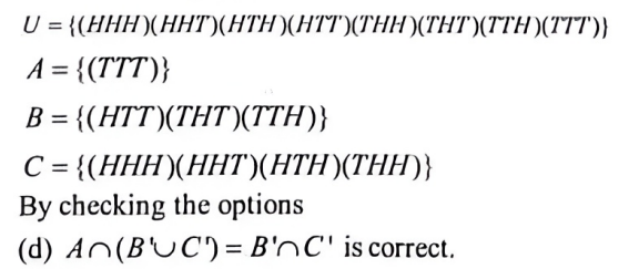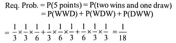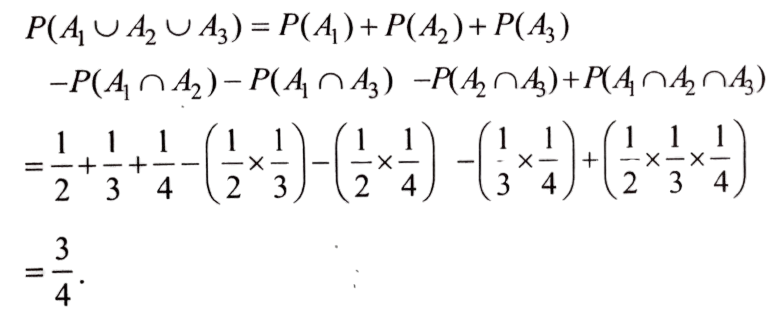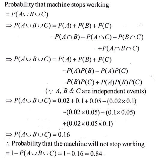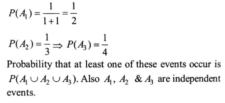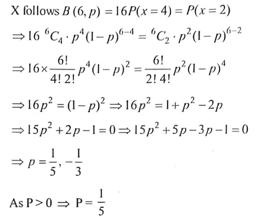 NDA/NA SOLVED PAPER 2016-II (MATHEMATICS)Total Questions: 120111. A medicine is known to be 75% effective to cure a patient. If the medicine is given to 5 patients, what is the probability that at least one patient is cured by this medicine?(a)(b)(c)(d)Correct Answer: (c)Solution:112. Solve the following equation(a) 3/7(b) 3/4(c) 1/3(d) 4/7Correct Answer: (a) 3/7Solution:113. A machine has three parts, A, B and C, whose chances of being defective are 0.02, 0.10 and 0.05 respectively. The machine stops working if any one of the parts becomes defective. What is the probability that the machine will not stop working?(a) 0.06(b) 0.16(c) 0.84(d) 0.94Correct Answer: (c) 0.84Solution:114. Three independent events, A₁ A₂ and A₃ occur with probabilities P(Aᵢ) = 1/(1 + i), i = 1, 2, 3. What is the probability that at least one of the three events occurs?(a) 1/4(b) 2/3(c) 3/4(d) 1/24Correct Answer: (c) 3/4Solution:115. Two variates, x and y, are uncorrelated and have standard deviations δₓ and δ🇾 respectively. What is the correlation coefficient between x + y and x - y ?(a)(b)(c)(d)Correct Answer: (c)Solution:116. A random sample of 20 people is classified in the following table according to their ages:AgeFrequency15-25225-35435-45645-55555-653What is the mean age of this group of people?(a) 41.0(b) 41.5(c) 42.0(d) 42.5Correct Answer: (b) 41.5Solution:117. If the covariance between x and y is 30, variance of x is 25 and variance of y is 144, then what is the correlation coefficient?(a) 0.4(b) 0.5(c) 0.6(d) 0.7Correct Answer: (b) 0.5Solution:118. A coin is tossed three times. Consider the following events:A: No head appears B: Exactly one head appears C: At least two heads appearWhich one of the following is correct?(a) (A ∪ B) ∩ (A ∪ C) = B ∪ C(b) (A ∩ B') ∪ (A ∩ C') = B' ∪ C'(c) A ∩ (B' ∪ C') = B' ∩ C'(d) A ∩ (B' ∪ C') = B' ∩ C'Correct Answer: (d) A ∩ (B' ∪ C') = B' ∩ C'Solution:119. In a series of 3 one-day cricket matches between teams A and B of a college, the probability of team A winning or drawing are 1/3 and 1/6 respectively. If a win, loss or draw gives 2, 0 and 1 point respectively, then what is the probability that team A will score 5 points in the series?(a) 17/18(b) 11/12(c) 1/12(d) 1/18Correct Answer: (d) 1/18Solution:120. Let the random variable X follow B (6, p). If 16 P(X = 4) = P(X = 2) then what is the value of p?(a) 1/3(b) 1/4(c) 1/5(d) 1/6Correct Answer: (c) 1/5Solution:Submit Quiz« Previous123456789101112