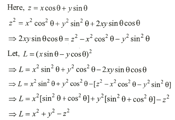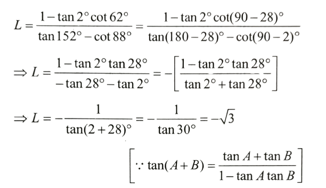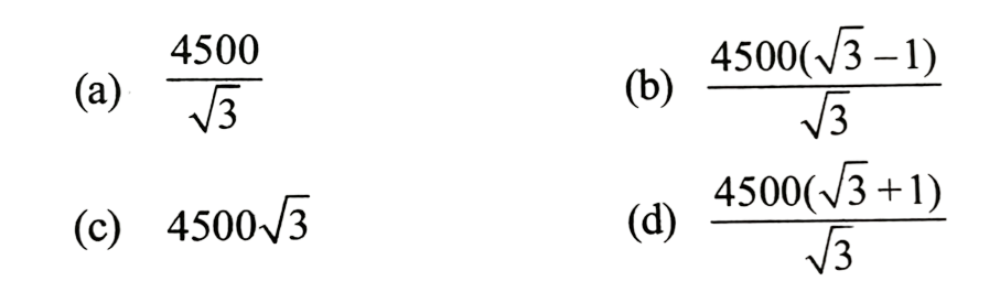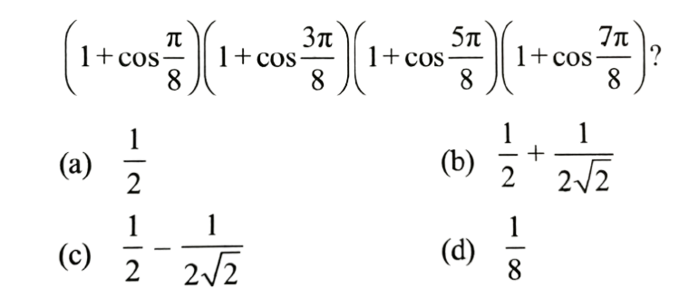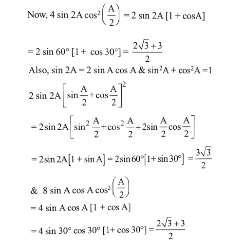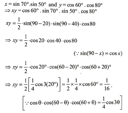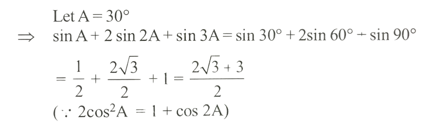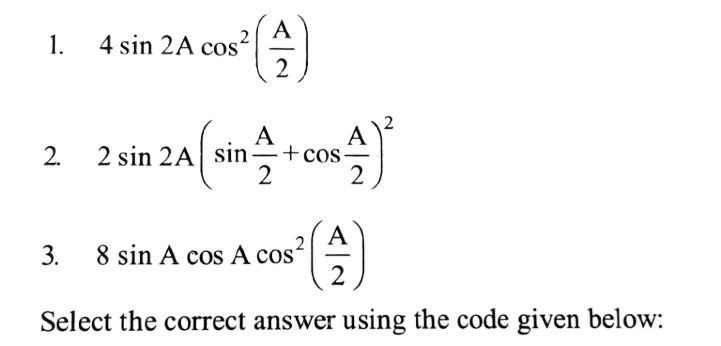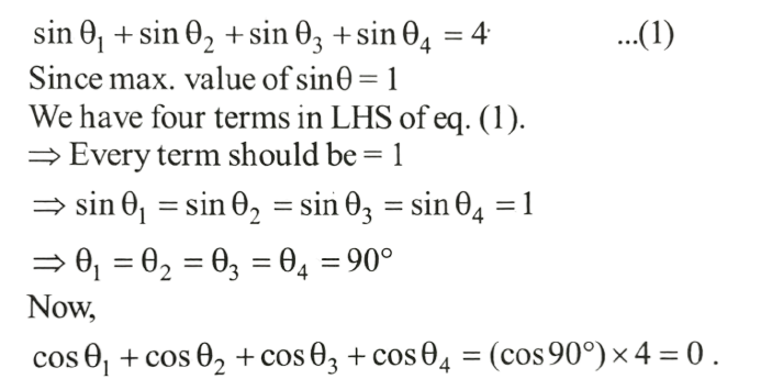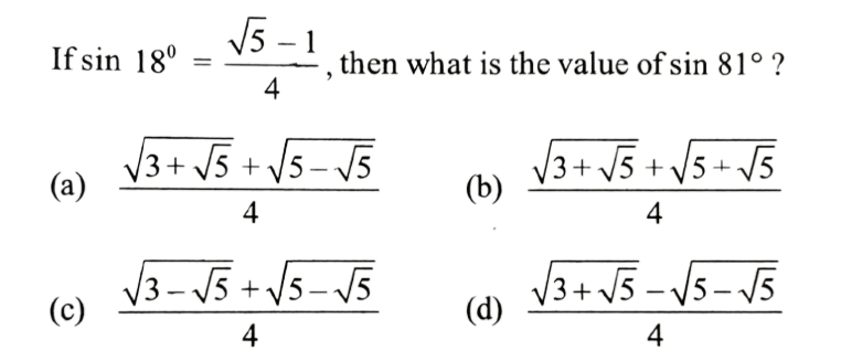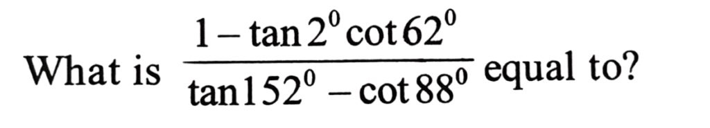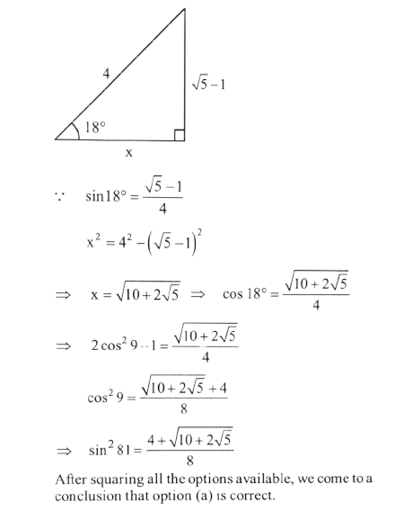 NDA/NA SOLVED PAPER 2016-II (MATHEMATICS)Total Questions: 12041. sin A + 2sin 2A + sin 3A is equal to which of the following?(a) 1 and 2 only(b) 2 and 3 only(c) 1 and 3 only(d) 1,2 and 3Correct Answer: (c) 1 and 3 onlySolution: 42. If x = sin 70⁰ . sin 50⁰ and y = cos 60⁰ . cos80⁰ , then what is xy equal to ?(a) 1/16(b) 1/8(c) 1/4(d) 1/2Correct Answer: (a) 1/16Solution:43. If sin θ₁ +sin θ₂ +sin θ₃ +sin θ₄ = 4, then what is the value of cos θ₁ + cos θ₂ + cos θ₃ +cos θ₄ =?(a) 0(b) 1(c) 2(d) 4Correct Answer: (a) 0Solution:44. What is the value of(a)(b)(c)(d)Correct Answer: (d)Solution: 45. If x cosθ + y sinθ = z, then what is the value of (x sinθ - y cosθ)² ?(a) x² + y² - z²(b) x² - y² - z²(c) x² - y² + z²(d) x² + y² + z²Correct Answer: (a) x² + y² - z²Solution:46. What is the value of cos( 2cos⁻¹(0.8) ?(a) 0.81(b) 0.56(c) 0.48(d) 0.28Correct Answer: (d) 0.28Solution:47. The top of a hill when observed from the top and bottom of a building of height h is at angles of elevation p and q respectively. What is the height of the hill?(a)(b)(c)(d)Correct Answer: (b)Solution: 48. Solve the following equation(a)(b)(c)(d)Correct Answer: (a)Solution:49. A moving boat is observed from the top of a cliff of 150 m height. The angle of depression of the boat changes from 60° to 45° in 2 minutes. What is the speed of the boat in metres per hour?(a)(b)(c)(d)Correct Answer: (b)Solution:50. Solve the following equation(a) √3(b) - √3(c) √2 - 1(d) 1 - √2Correct Answer: (b) - √3Solution:Submit Quiz« Previous123456789101112Next »