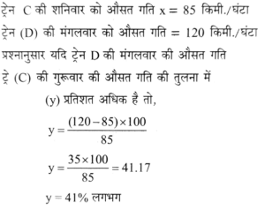 5. If the mean of the average speed of train C during all the six days is 25% less than the average speed of train B on Saturday, then the average speed of train D on Tuesday is approximately ___ % more than that of train C on Thursday./यदि ट्रेन C की सभी छह दिनों के दौरान औसत गति का माध्य ट्रेन B की शनिवार की औसत गति की तुलना में 25% कम है, तो ट्रेन D की मंगलवार की औसत गति, ट्रेन C की गुरुवार की औसत गति की तुलना में लगभग % अधिक होगी?