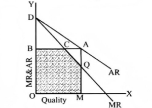 Solution:औसत राजस्व (AR) और सीमान्त राजस्व (MR) दोनों वक्र सीधी रेखा के आकार के होते है, यह दिखाया जा सकता है कि (MR) वक्र (ARI) वक्र और Y-अक्ष के बीच में काटेगा, दूसरे शब्दों में, जब AR, और MR दोनों वक्र Fसीधी रेखएँ हो, तो यदि AR वक्र पर किसी बिन्दु से F-अक्ष पर लम्ब खींचा जाता है, तो MR वक्र इस लम्ब को उसके मध्य बिन्दु परप कटेगा।