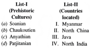 Solution:The Soanian culture, found in the Siwalik Hills of North India, is a Lower Paleolithic industry. Chaukoutien, in China, is famous for Peking Man, an early Homo erectus site. Anyathian is a prehistoric industry in Myanmar, while Patjitanian is a similar industry from Java, reflecting early human settlements in Southeast Asia.