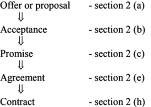 A valid contract have such essential element's agreement's promise offer proposal acceptance. The correct sequence of making of a contract:-
