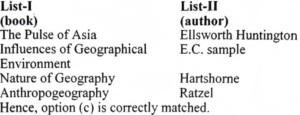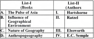 He made a significant effort to explain various conceptual aspects, such as the concept of the earth's surface, the concept of regional differentiation, the concept of landscape, possibilism, and dualism in geography, in simple language and with illustrations. Albrecht Penck is primarily known for his work on mapping, geomorphology, and climate classification. Note: NTA has considered option (c) to be the correct answer to this question, which is incorrect. Therefore, none of the given options can be selected.