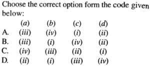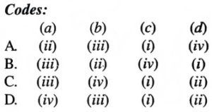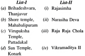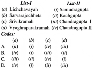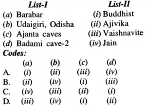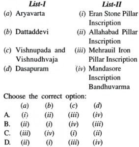 NTA UGC NET/JRF Exam December-2019 ARCHAEOLOGYTotal Questions: 10071. Match the following caves of List-I with the sects of List-II to which they are associated:A.B.C.D.Correct Answer: B.72. Match the coins legend of List-I with names of the king given in List-II and choose the correct answer from the code given below:A.B.C.D.Correct Answer: C.73. Match the items of List-I with inscriptions of List-II.A.B.C.D.Correct Answer: D.74. Match the temples of List-I with patron kings of List-IІ.A.B.C.D.Correct Answer: B.75. Match the books of List-I with authors of List-II: List-I List-II (a) Salabhanjika in Art, Philosophy and Literature (i) J. Rosenfield (b) Salabhanjika-Woman and Tree in Art and Literature (ii) Nihar Ranjan Ray (c) Dynastic Art of the Kushanas (iii) Udai Narayan Roy (d) Mauryan and Post Mauryan Art (iv) Devangana DesaiA.B.C.D.Correct Answer: D.76. Arrange the primitive human types in descending order:(a) Australopithecus afarensis (b) Australopithecus robustus (c) Pithecanthropus trinilensis (d) Australopithecus africanus Choose the correct answer from the code given below:A. (a), (c), (b), (d)B. (c), (d), (b), (a)C. (a), (d), (b), (c)D. (b), (d), (a), (c)Correct Answer: C. (a), (d), (b), (c)77. Arrange the following periods of the Geological time scale in ascending order:(a) Cretaceous (b) Pre-cambrian (c) Devonian (d) Permian Choose the correct answer from the code given below:A. (b), (d), (a), (c)B. (a), (d), (c), (b)C. (c), (b), (a), (d)D. (d), (b), (c), (a)Correct Answer: B. (a), (d), (c), (b)78. Arrange the tenure of Archaeological work of following in chronological order:(a) Colonel Todd (b) Alexander Cunningham (c) D. Lal (d) Mortimer Wheeler Choose the correct answer from the code given below:A. (a), (b), (c), (d)B. (b), (a), (d), (c)C. (d), (c), (b), (a)D. (c), (d), (a), (b)Correct Answer: B. (b), (a), (d), (c)79. Arrange the following archaeological sites in chronological order:(a) Visadi (b) Sambhar (c) Yeleswaram (d) Rupar Choose the correct answer from the code given below:A. (a), (b), (c), (d)C. (b), (a), (c), (d)D. (a), (b), (d), (c)D. (a), (b), (d), (c)Correct Answer: D. (a), (b), (d), (c)80. Arrange the following in chronological order:(a) Ghat- Shpaped terracotta bead (b) Squat gray dish-on-stand (c) Sprinkler (d) Bull- Shaped Bottle Choose the correct option from the following:A. (b), (d), (a), (c)B. (d), (c), (b), (a)C. (c), (a), (b), (d)D. (a), (b), (d), (c)Correct Answer: A. (b), (d), (a), (c)Submit Quiz« Previous12345678910Next »