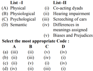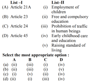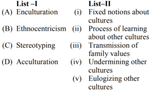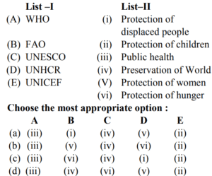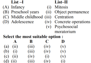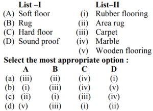 NTA UGC NET-JRF EXAM, June 2019 Paper II (HOME SCIENCE)Total Questions: 10091. Match List-I with List-II :(a)(b)(c)(d)Correct Answer: (a)Solution:92. Match List-I with List-II :(a)(b)(c)(d)Correct Answer: (a)Solution:93. Match List-I with List-II :(a)(b)(c)(d)Correct Answer: (a)Solution:94. Match List-I with List-II : Select the most appropriate option : (a)(b)(c)(d)Correct Answer: (b)Solution:95. Match List-I with List-II :(a)(b)(c)(d)Correct Answer: (c)Solution:96. Match List-I with List-II :(e) *(a)(b)(c)(d)Correct Answer: (e) *97. What is the rule of ASHA?(a) Access to health care of pregnant women at household level(b) To provide cash transfers(c) To provide antenatal care(d) To provide supplementary careCorrect Answer: (a) Access to health care of pregnant women at household levelSolution:Role of ASHA is to access to health care of pregnant women at household level.98. Cash transfers to women in JSY are to cover which of the following visible costs during delivery?(a) Cost of accompanying attendant(b) Drugs supply(c) Fee to hospital staff(d) Cost of foodsCorrect Answer: (b) Drugs supplySolution:Drug supply comes under visible cost for which cash is transfer to women in JSY (Janani Suraksha Yojana).99. Following are the component of JSY.(a) Access to health care of pregnant women at household level(b) To provide cash transfers(c) To provide antenatal care(d) To provide supplementary careCorrect Answer: (c) To provide antenatal careSolution:Component of JSY is : • To encourage hospital deliveries • Improve access to obstetric care • Cash transfer.100. What are the rationale of providing care to pregnant women under JSY?(a) Access to institutional deliveries(b) To reduce material mortality(c) To reduce neo-natal mortality(d) to provide cash benefit before deliveryCorrect Answer: (d) to provide cash benefit before deliverySolution:Rationale of providing care to pregnant women under JSY :– • Access to institutional deliveries • To reduce maternal mortally • To reduce neo-natal mortality.Submit Quiz« Previous12345678910