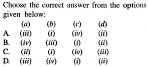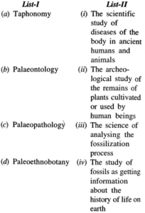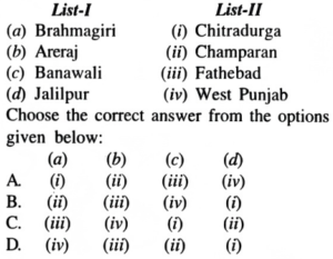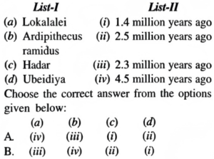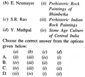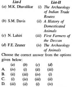 NTA UGC NET/JRF Exam June-2020 ARCHAEOLOGYTotal Questions: 10061. Roultted ware is now considered an Indian ware and not Roman due to studies conducted by which of these scholars?(a) Lewis Binford (b) V.D. Gogte (c) David Clarke (d) Heldrun Schenk Choose the correct answer from the options given below:A. (a), (b) and (d) onlyB. (a) and (c) onlyC. (b) and (d) onlyD. (a) and (d) onlyCorrect Answer: C. (b) and (d) only62. Who among the following were the first two to the issue Asvamedha type gold coins?(a) Samudragupta (b) Skandagupta (c) Chandragupta II (d) Kumaragupta I Choose the correct answer from the options given below:A. (a) and (b) onlyB. (a) and (d) onlyC. (c) and (d) onlyD. (b) and (c) onlyCorrect Answer: B. (a) and (d) only63. Which among the following temples is known for erotic sculptures on the exterior wall?(a) Sun Temple of Konark (b) Brihadeshwara Temple of Thanjavur (c) Kandariya Mahadev temple (d) Gangaikondacholapuram Choose the most appropriate answer from the options given below:A. (b) and (d) onlyB. (a) and (c) onlyC. (b) and (c) onlyD. (a) and (d) onlyCorrect Answer: B. (a) and (c) only64. Who among the following kings started Indianizing coin devices?(a) Kanishka (b) Samudragupta (c) Chandragupta II (d) Azes Choose the correct answer from the options given below:A. (a) and (b) onlyB. (b) and (c) onlyC. (c) and (d) onlyD. (b) and (d) onlyCorrect Answer: B. (b) and (c) only65. Which two of the following inscriptions make reference to punch-marked coins?(a) Nanaghat cave inscription of Naganika (b) Nasik cave inscription of Balasri (c) Nasik cave inscription of Pulumavi (d) Nasik cave inscription of Usavadatta Choose the correct answer from the options given below:A. (b) and (c) onlyB. (a) and (c) onlyC. (a) and (d) onlyD. (b) and (d) onlyCorrect Answer: C. (a) and (d) only66. Match List-I with List-II:A.B.C.D.Correct Answer: D.67. Match List-I with List-II:A.B.C.D.Correct Answer: C.68. Match List-I with List-II:A.B.C.D.Correct Answer: D.69. Match List-I with List-II:A.B.C.D.Correct Answer: B.70. Match List-I with List-II:A.B.C.D.Correct Answer: A.Submit Quiz« Previous12345678910Next »