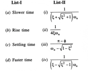 NTA UGC NET/JRF Exam, June -2020 (Electronic Science)Total Questions: 10071. Match List-I with List-IIList-I (Interrupt)List-II (ROM location (Hex.))(a) Reset(i) 001B(b) External hardware int. 0 (INT0)(ii) 0003(c) Timer 0 interrupt (TF0)(iii) 000B(d) Timer 1 interrupt (TF1)(iv) 0000Choose the correct answer from the options given below:(a)(b)(c)(d)A.(iv)(ii)(iii)(i)B.(iv)(iii)(ii)(i)C.(iii)(ii)(iv)(i)D.(i)(ii)(iii)(iv)A.B.C.D.Correct Answer: A.72. Match List-I with List-IIList-IList-II(a) Klystron(i) Slow structure(b) Transfer Electron devices(ii) Bunching(c) MESFET(iii) Warm electrons(d) Travelling wave tube(iv) Pinch - offChoose the correct answer from the options given below:(a)(b)(c)(d)A.(ii)(iii)(iv)(i)B.(i)(iii)(ii)(iv)C.(iii)(ii)(i)(iv)D.(iv)(iii)(ii)(i)A.B.C.D.Correct Answer: A.73. Match List-I with List-IIList-IList-II(a) DPSK(i) Non coherent detector(b) AM(ii) Ratio detector(c) FM(iii) Coherent detector(d) DSB- SC(iv) Rectifier detectorChoose the correct answer from the options given below:(a)(b)(c)(d)A.(i)(iv)(ii)(iii)B.(iii)(i)(iv)(ii)C.(ii)(iii)(i)(iv)D.(iv)(ii)(iii)(i)A.B.C.D.Correct Answer: A.74. Match List-I with List-IIChoose the correct answer from the options given below:(a)(b)(c)(d)A.(i)(iii)(iv)(ii)B.(ii)(iii)(iv)(i)C.(iv)(iii)(ii)(i)D.(iii)(iv)(i)(ii)A.B.C.D.Correct Answer: C.75. Match List-I with List-IIList-IList-II(Symbol)(Value)(a) da(i) 10⁻¹⁵(b) d(ii) 10⁻¹ (c) f(iii) 10⁻¹⁸(d) a(iv) 10 Choose the correct answer from the options given below:(a)(b)(c)(d)A.(iv)(ii)(i)(iii)B.(ii)(iv)(i)(iii)C.(i)(ii)(iii)(iv)D.(iv)(ii)(iii)(i)A.B.C.D.Correct Answer: A.76. Arrange the following semiconductor(a) ZnSe (b) InAs (c) CdTe (d) Ge (e) InP Choose the correct answer from the options given below:A. (d), (c), (b), (a), (e)B. (c), (b), (a), (e), (d)С. (b), (a), (d), (c), (e)D. (a), (c), (e), (d), (b)Correct Answer: D. (a), (c), (e), (d), (b)77. The sequence of first to last step involved in a typical silicon gate n - MOS transistor is:(a) Gate oxidation (b) Contact cuts (c) Patterning SiO₂ layer (d) Implant or diffusion (e) Patterning of aluminium layer Choose the correct answer from the options given below:A. (c), (d), (a), (b), (e)B. (b), (d), (a), (c), (e)C. (c), (a), (d), (b), (e)D. (b), (a), (d), (e), (c)Correct Answer: C. (c), (a), (d), (b), (e)78. Arrange the Nyquist sampling interval of the signal in descending order:(a) sin c (300t) (b) sin c (300t) + sin c² (300t) (c) sin c (200t) (d) sin c (200r) + sin c² (200t) (e) sin c (200t) + sin с (500t) Choose the correct answer from the options given below:A. (d), (c), (b), (d), (e)B. (c), (d), (e), (a), (b)C. (c), (a), (d), (e), (b)D. (a), (e), (d), (c), (b)Correct Answer: C. (c), (a), (d), (e), (b)79. Compare the output signal swing of the following power amplifiers:(a) Class A (b) Class B (c) Class AB (d) Class C Choose the correct answer from the options given below:A. (a) > (b) > (c) > (d)B. (d) > (c) > (b) > (a)C. (d) > (b) > (c) > (a)D. (a) > (c) > (b) > (d)Correct Answer: D. (a) > (c) > (b) > (d)80. For designing a sequential circuit, the following steps are used as general methodology:(a) State Assignment and transition table (b) State diagram (c) State table (d) Realization (e) k-maps and minimal expressions The sequence of these steps in order of their execution is: Choose the correct answer from the options given below:A. (c), (a), (b), (e), (d)B. (e), (b), (a), (d), (с)C. (a), (b), (e), (c), (d)D. (b), (c), (a), (e), (d)Correct Answer: D. (b), (c), (a), (e), (d)Submit Quiz« Previous12345678910Next »
